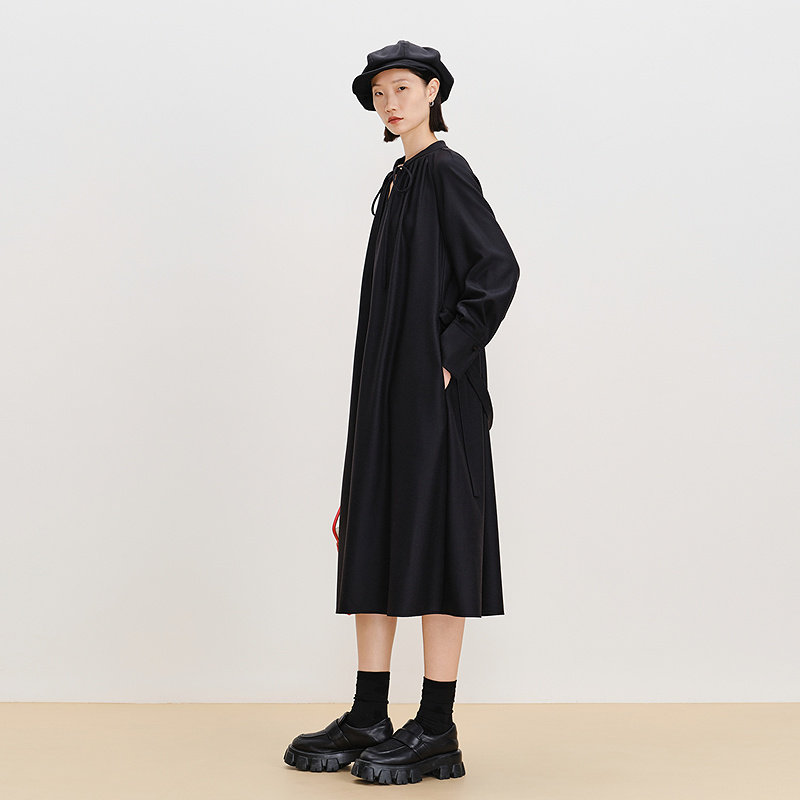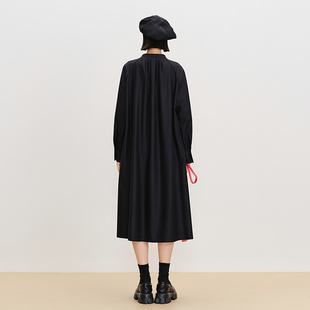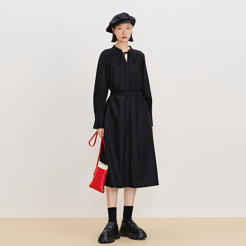 绒面羊毛呢圆领A摆黑色连衣裙休闲长裙女 AUM噢姆春季 商场同款