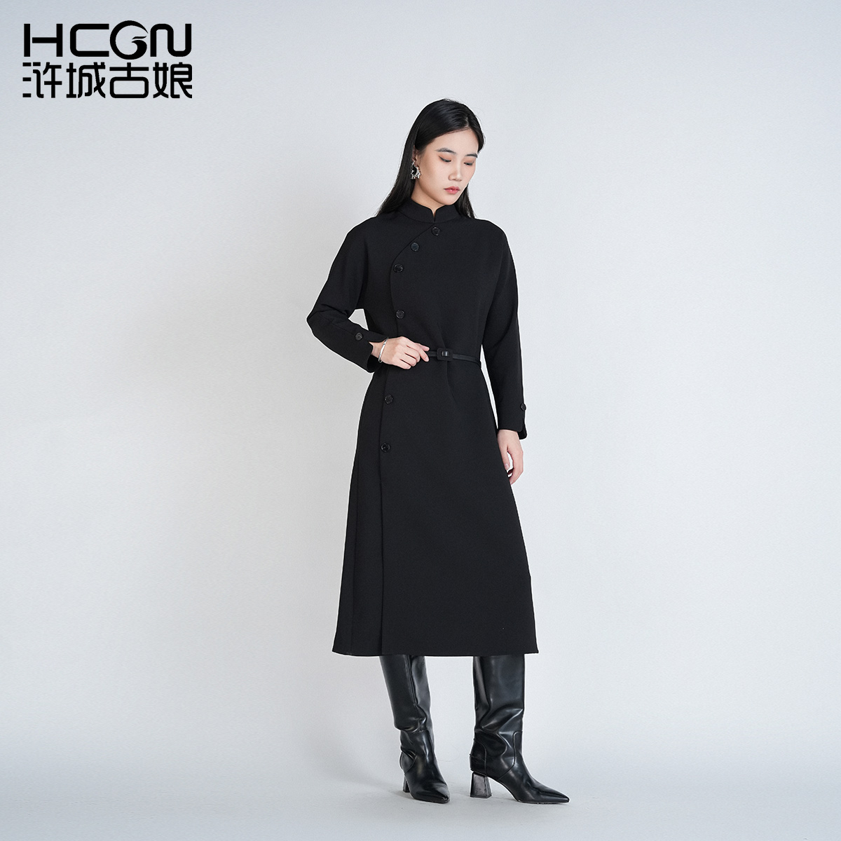 中国风春秋新款 立领女士收腰纯色通勤旗袍连衣裙 气质百搭长袖