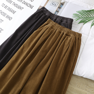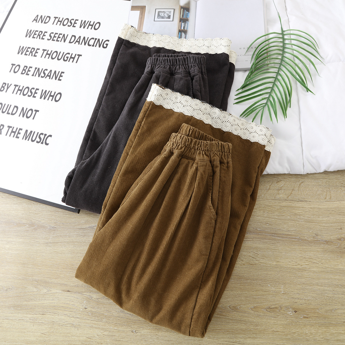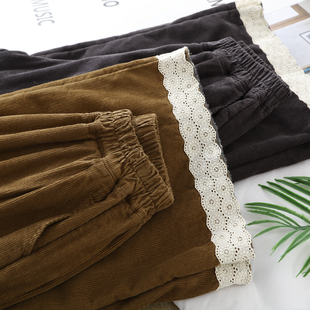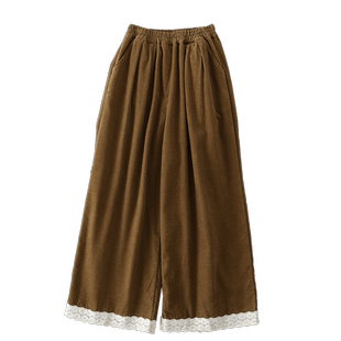 蕾丝花边拼接灯芯绒加绒阔腿裤 女2024文艺简约松紧腰保暖休闲长裤