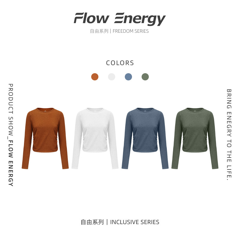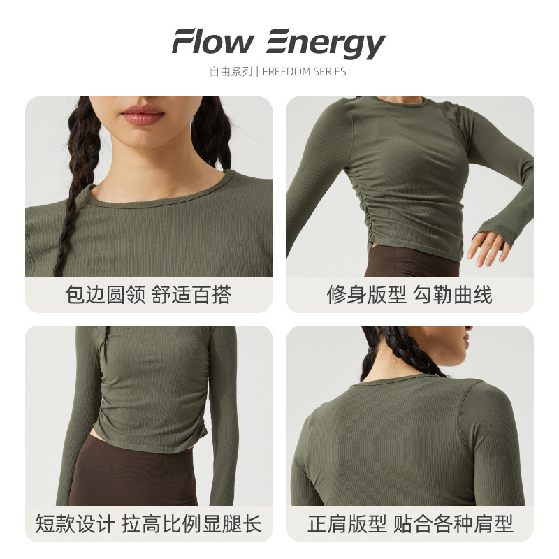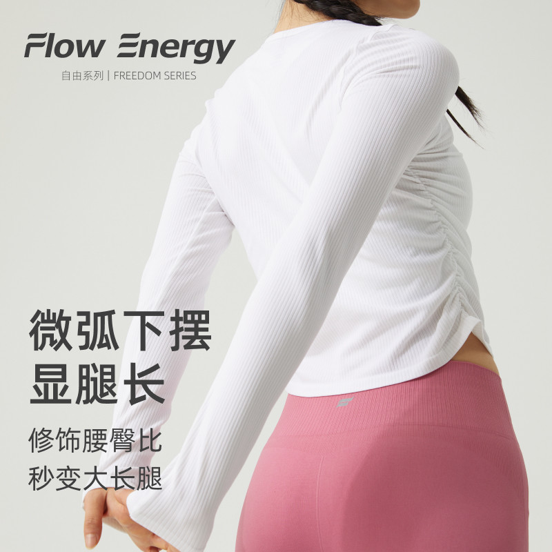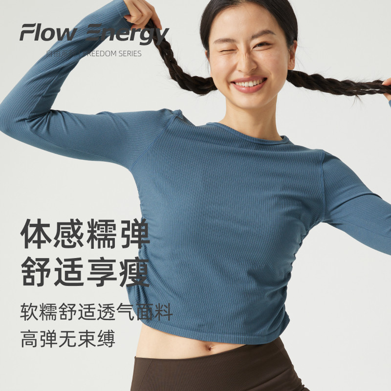 FlowEnergy罗纹运动T恤女抽褶弹力修身 显瘦健身普拉提瑜伽长袖