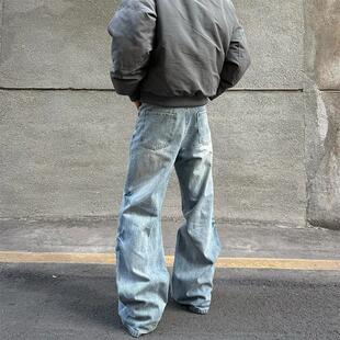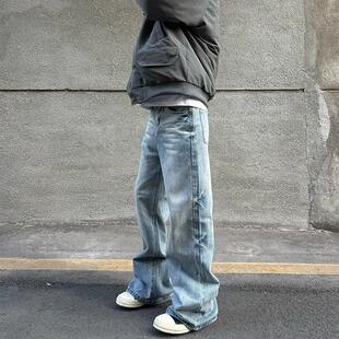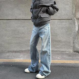 子情侣 男复古百搭宽松裤 HY711 水洗冰蓝色磨白猫须直筒微喇牛仔裤