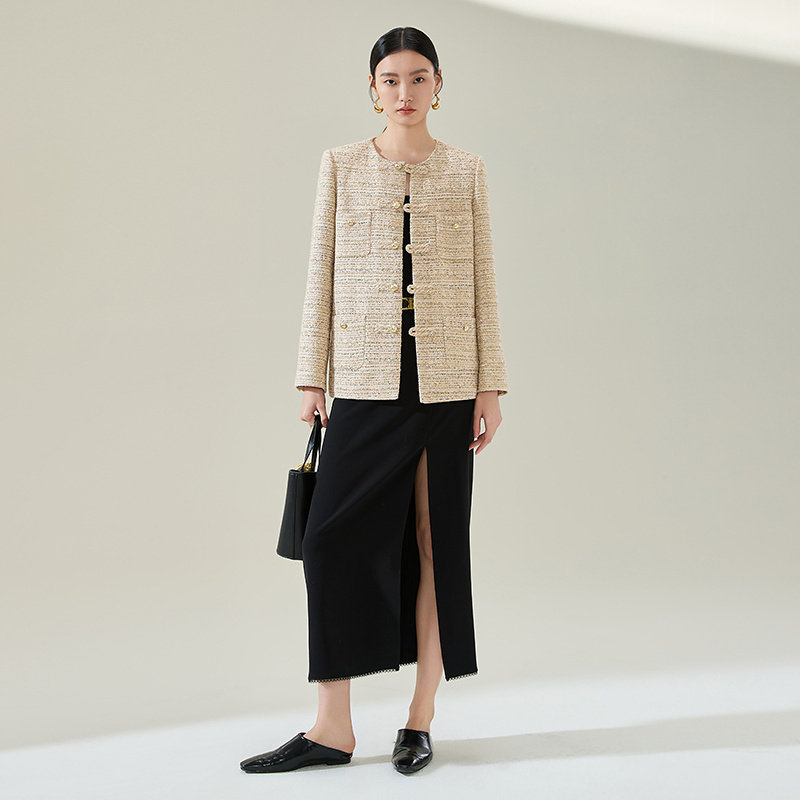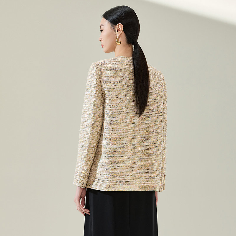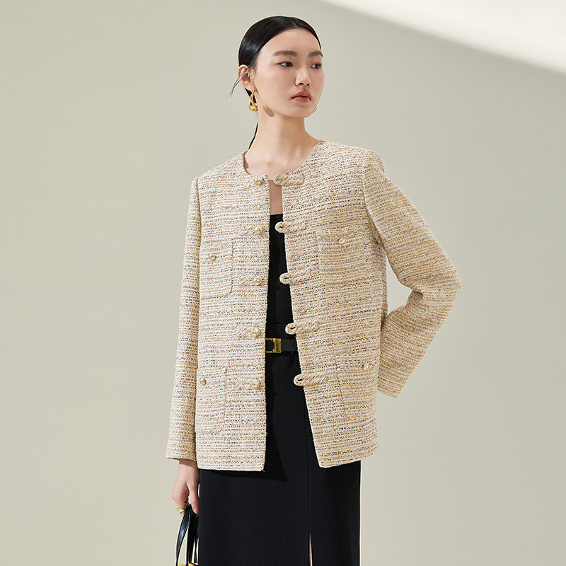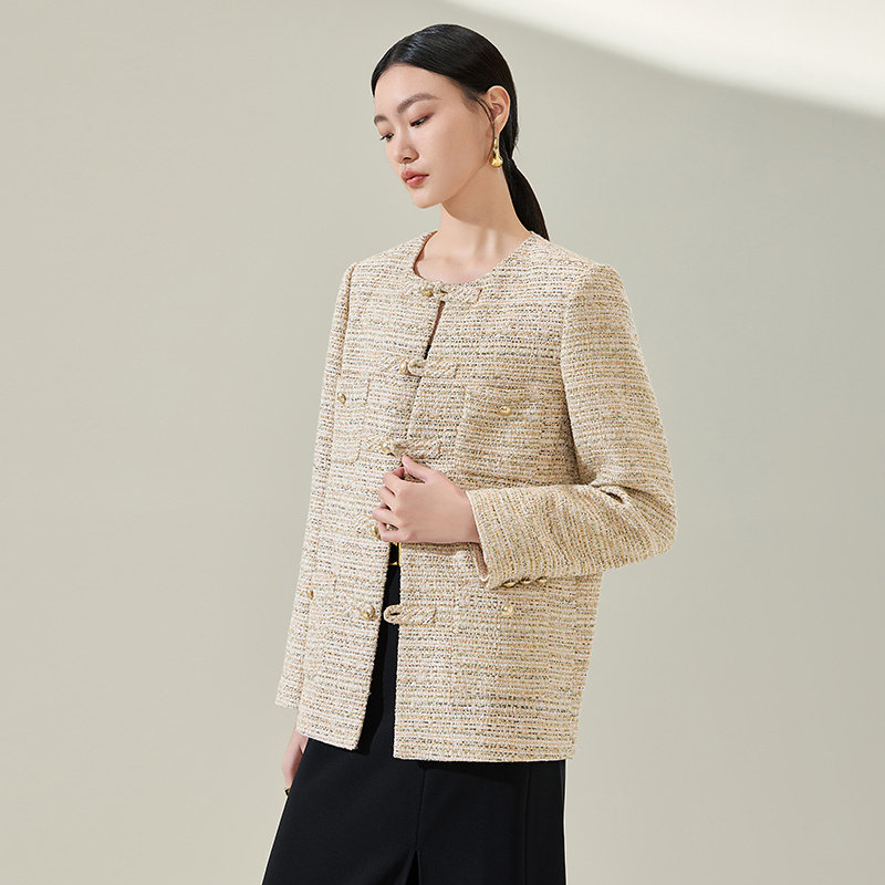 新中式 桃色短外套 盘扣设计粗花呢上衣女MOFAN摩凡春秋新款