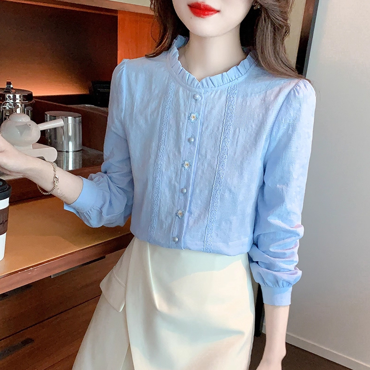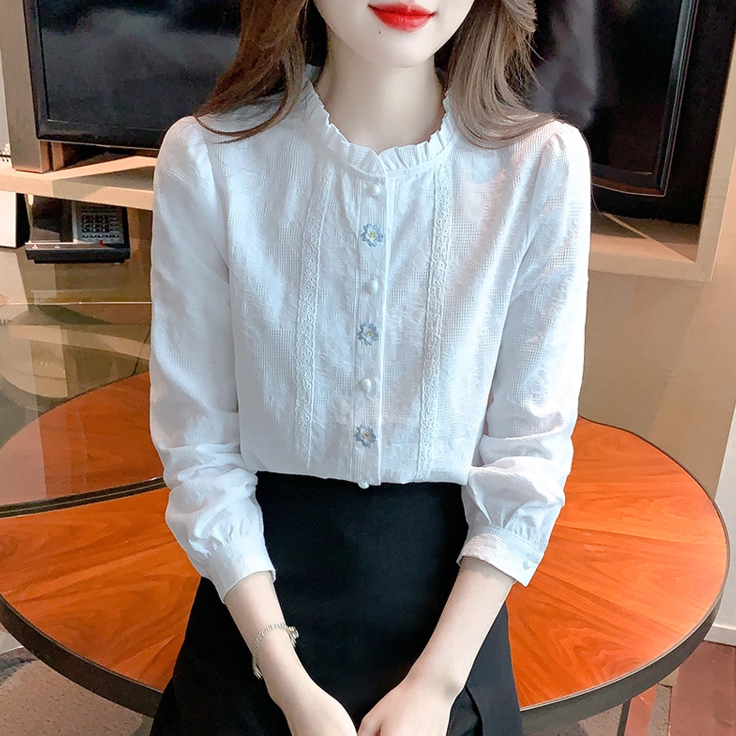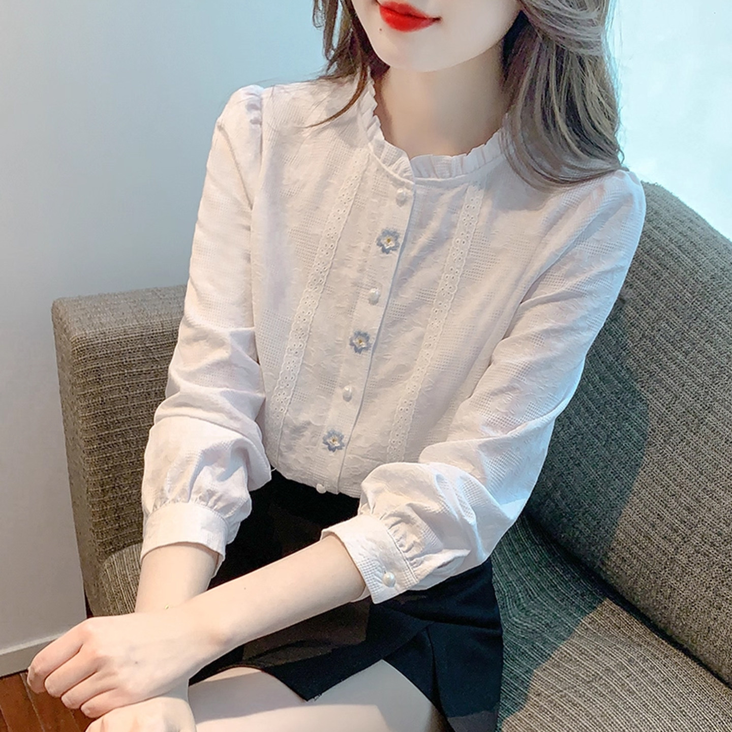 2026年法式 春装 刺绣木耳边立领全棉衬衣减龄内搭上衣 女长袖 白衬衫