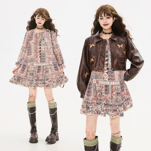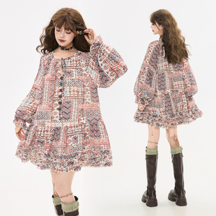 KEIKO波西米亚风长袖 异域风情出游度假褶花A字雪纺裙子 连衣裙秋季