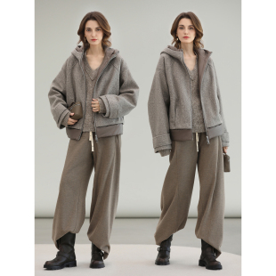 COCOBELLA假两件连帽毛呢外套女秋冬仿水波纹短款 呢子大衣WL3205