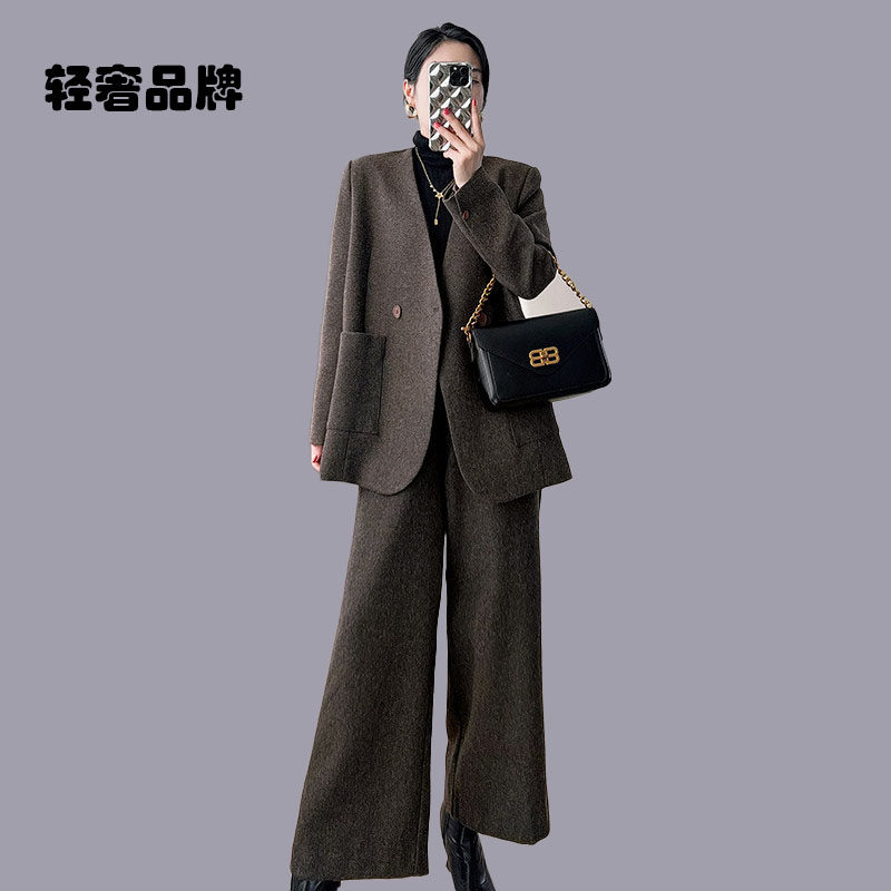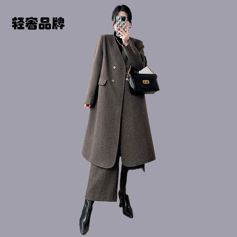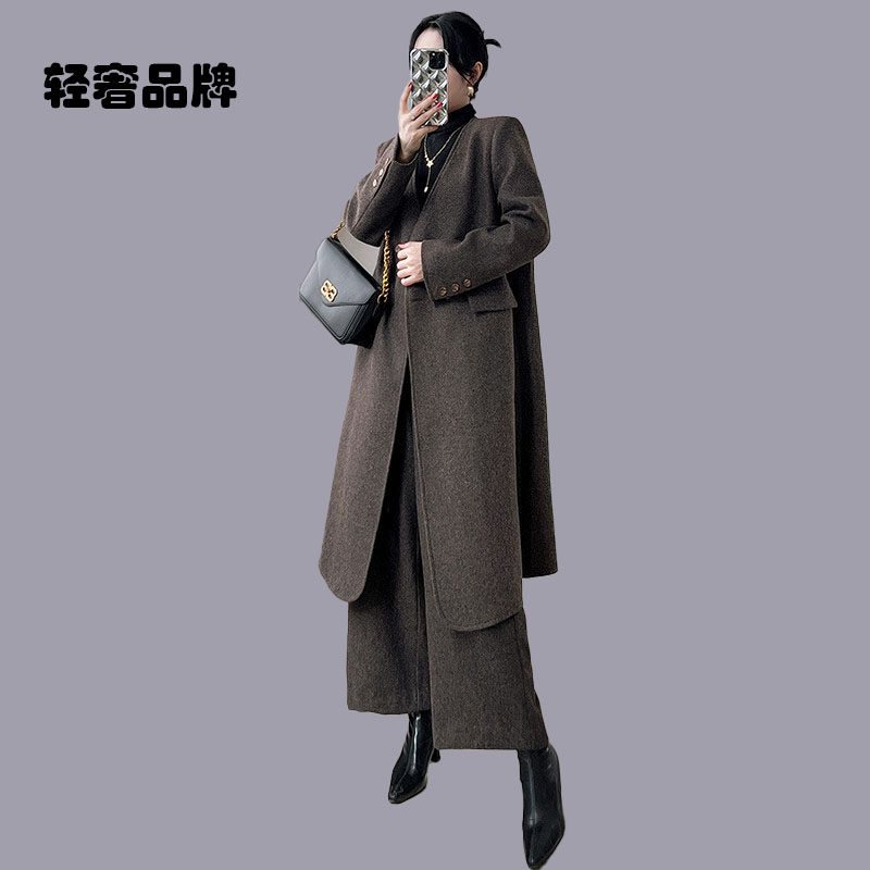 子两件套直筒过膝长款 女羊毛大衣裤 毛呢外套 2026新款 朗姿约定套装