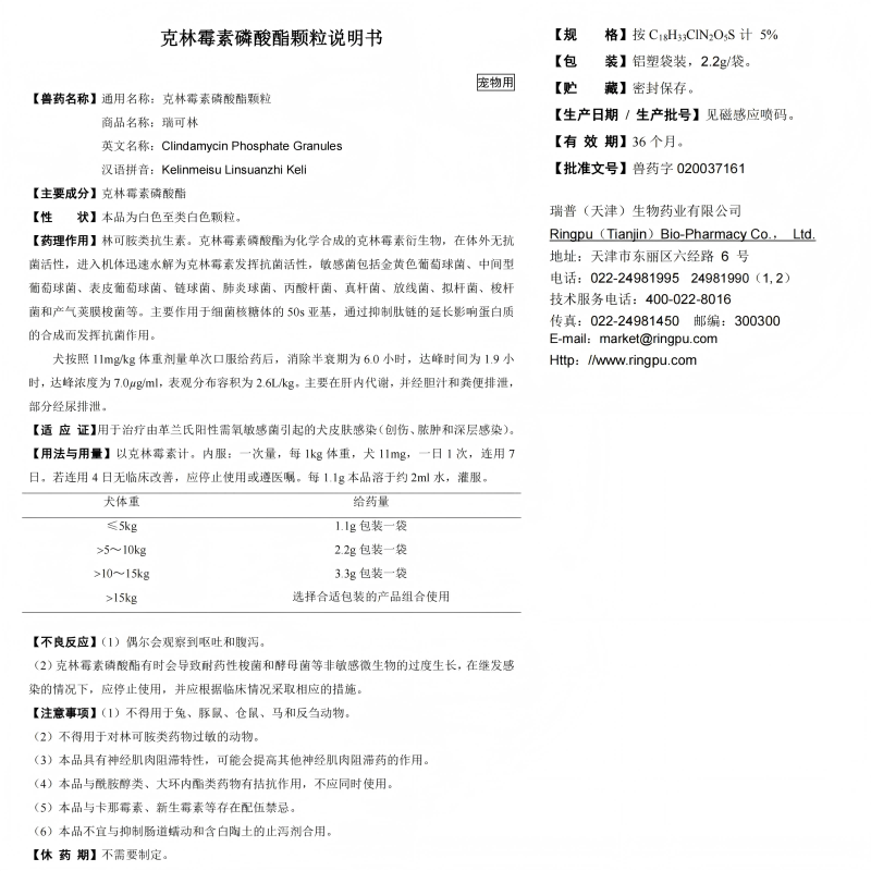 瑞普瑞可林克林霉素磷酸酯颗粒犬皮肤感染创伤脓肿深层感染抑菌