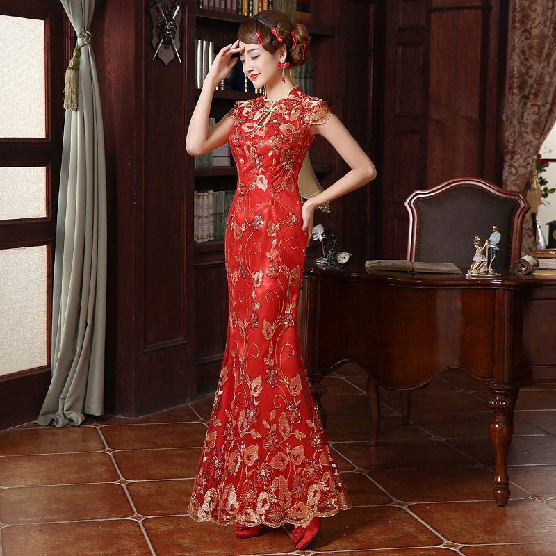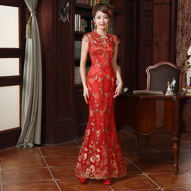 显瘦旗袍鱼尾结婚礼服夏 敬酒服新娘复古改良修身 2020新款 红色长款