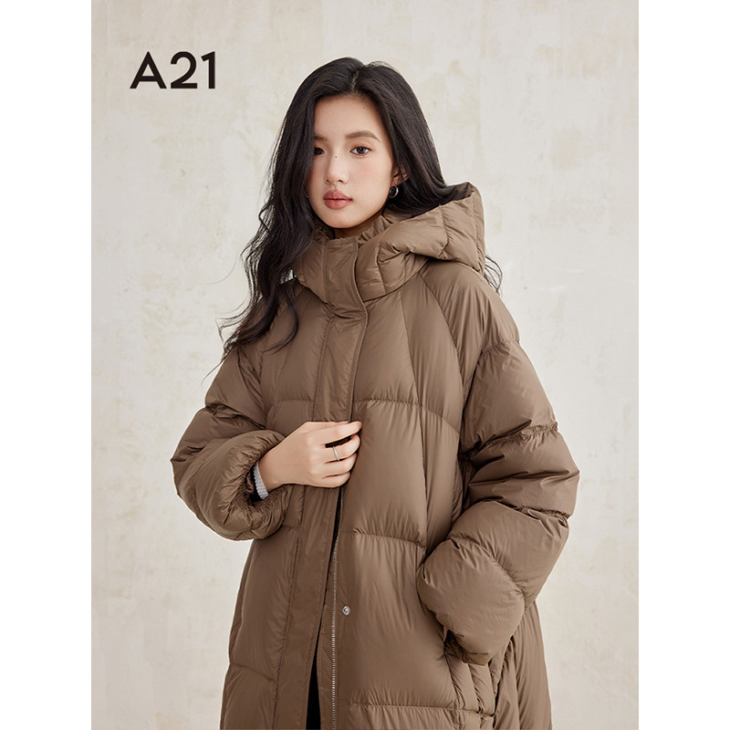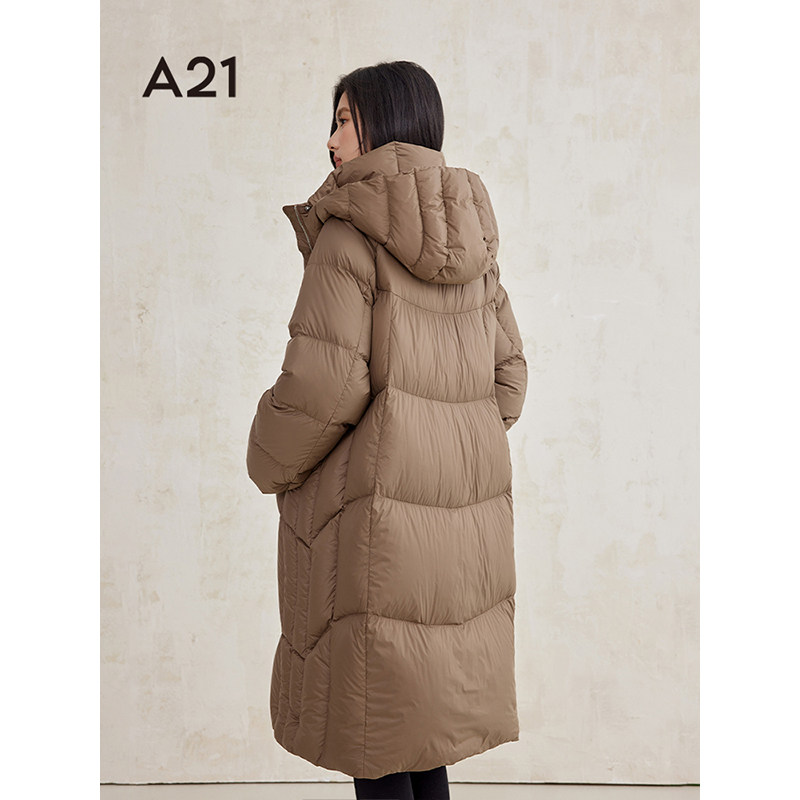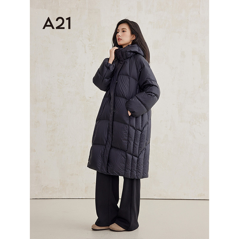 韩版 A21女装 新款 黑色羽绒服2024冬季 设计感连帽过膝鸭绒套外 长款