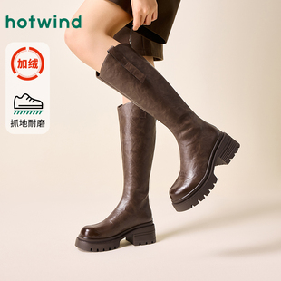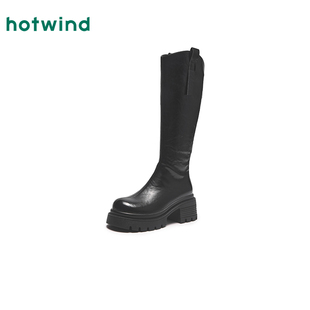 热风厚底长筒靴女2024年冬季 骑士靴子黑色粗跟高筒靴H85W4427 新款
