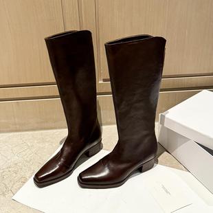 真皮 内增高粗跟骑士靴女秋冬西部靴高筒复古显瘦褶皱堆堆靴长靴