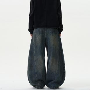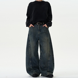 子ins 男宽松休闲baggy阔腿裤 MADWITCH美式 复古解构水洗弯刀牛仔裤