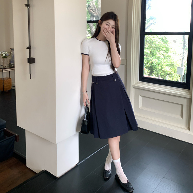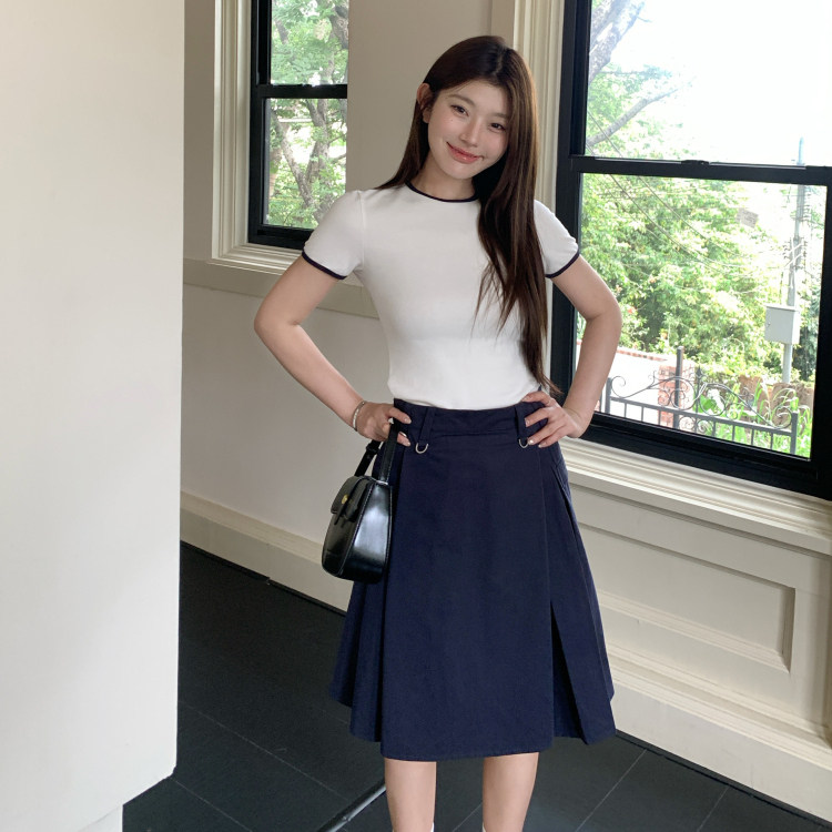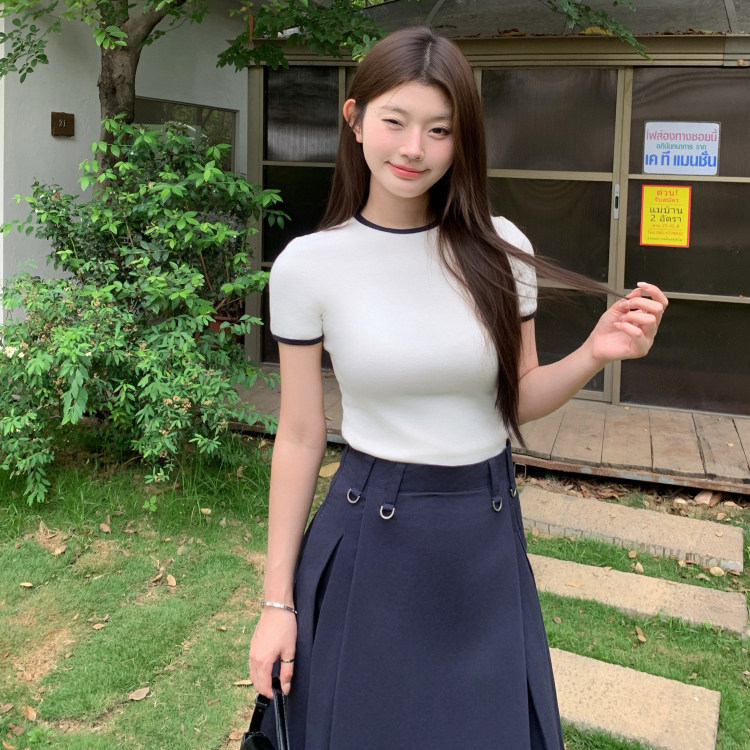修身 mode藏青色罗拉撞色圆领正肩短袖 T恤棉质夏休闲韩 1ess