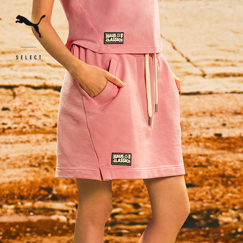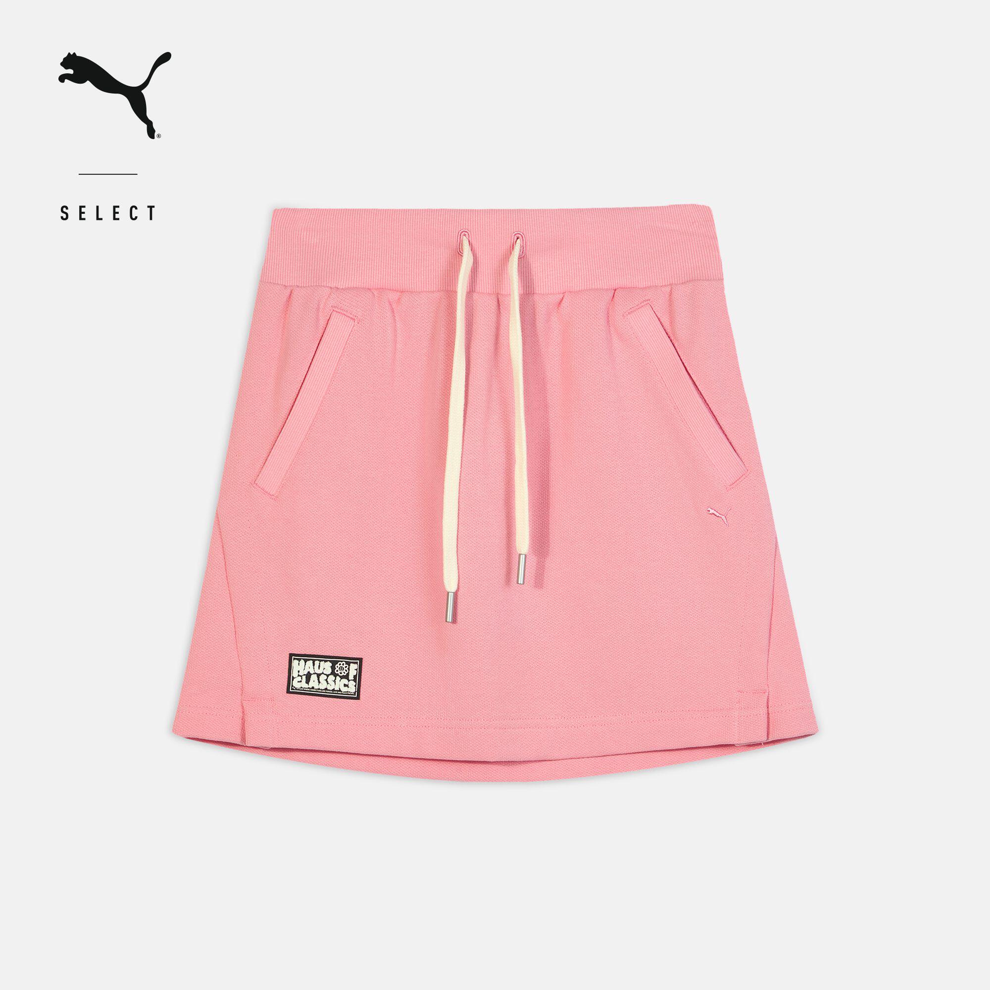 纯棉复古粉色半身休闲短裙女子PUMA彪马徽章抽绳开衩运动裙633732