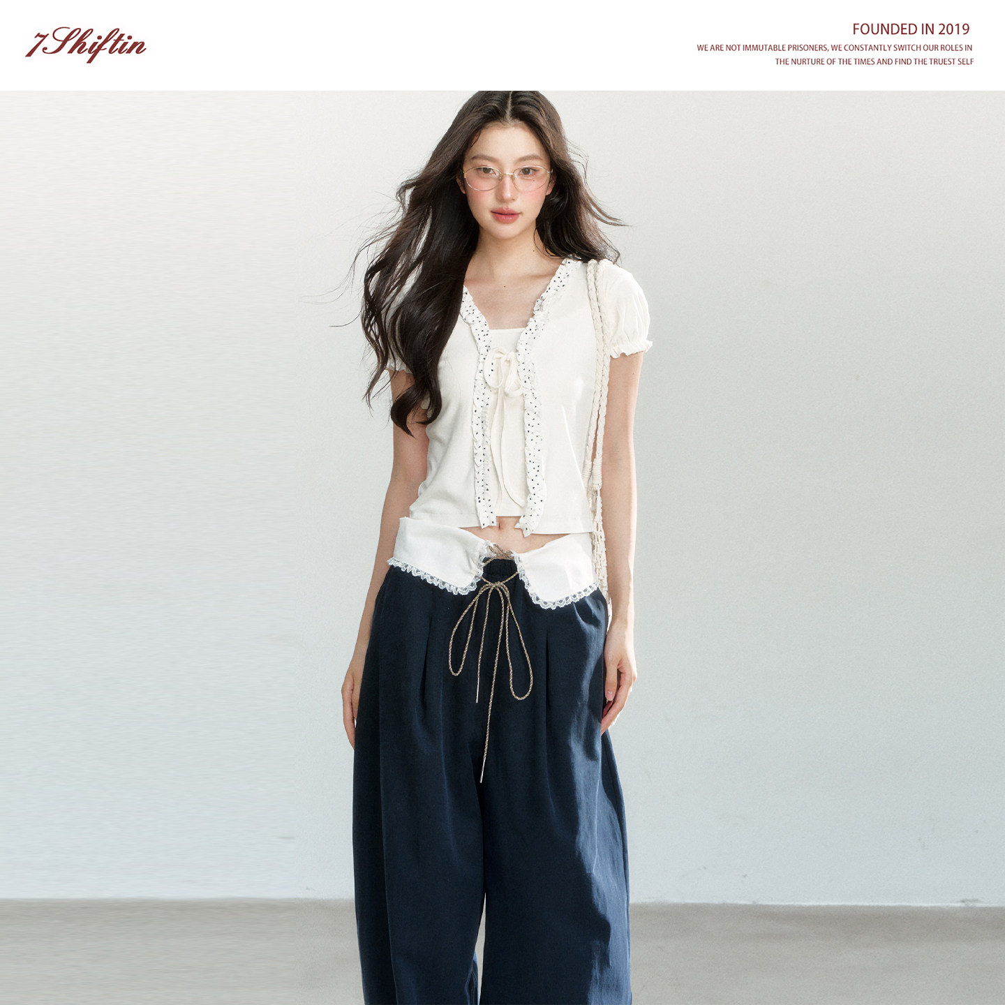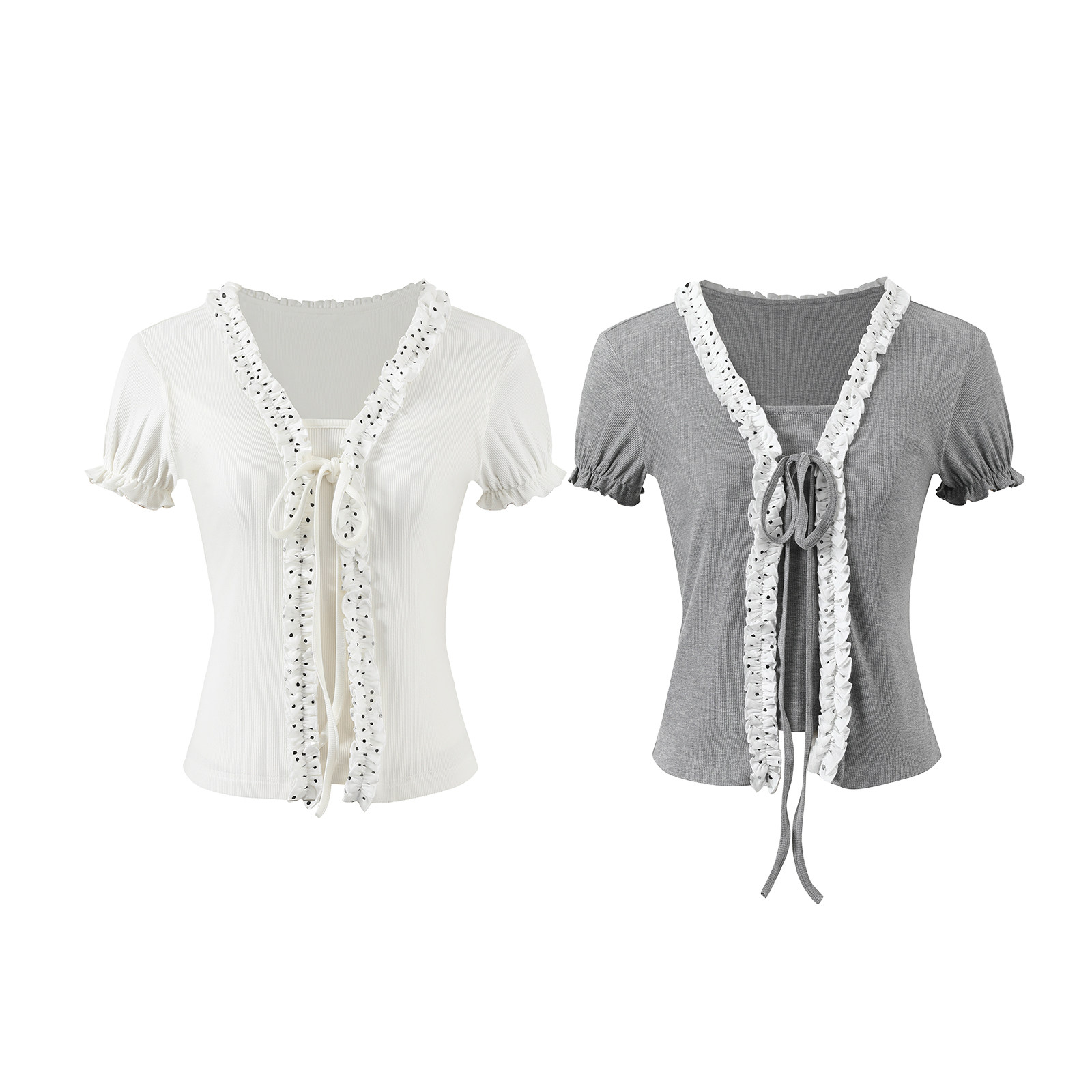 蕾丝绑带短袖 修身 T恤 原创设计双色甜美假两件上衣泡泡袖 7Shiftin