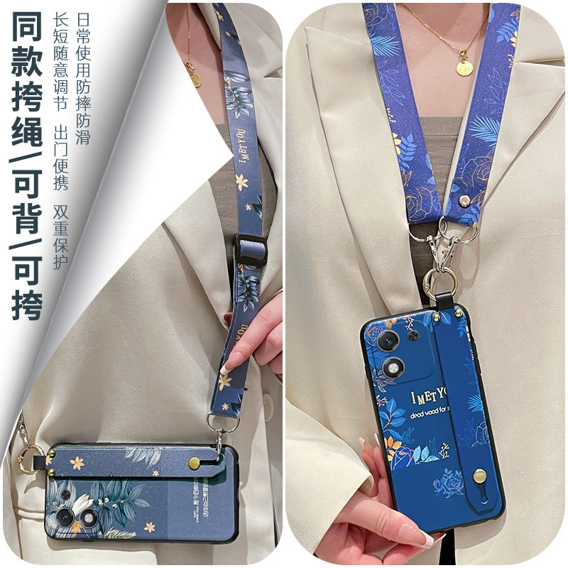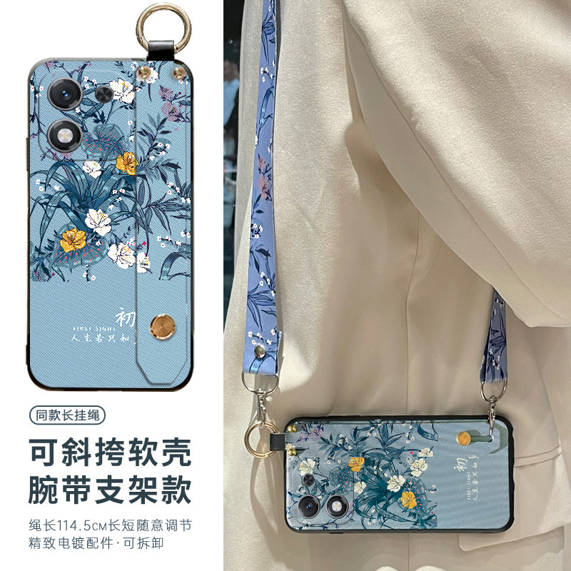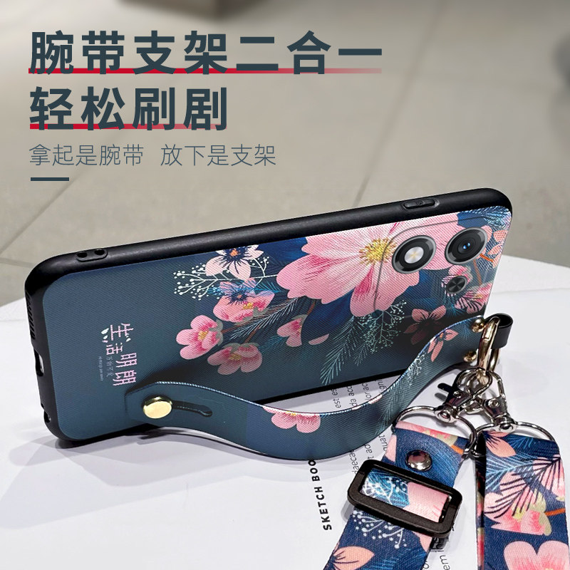 适用荣耀x70i手机壳ABRAN00全包防摔硅胶软保护套ryx70腕带支架斜挎可挂脖绳x70i花朵文字时尚 中国风女