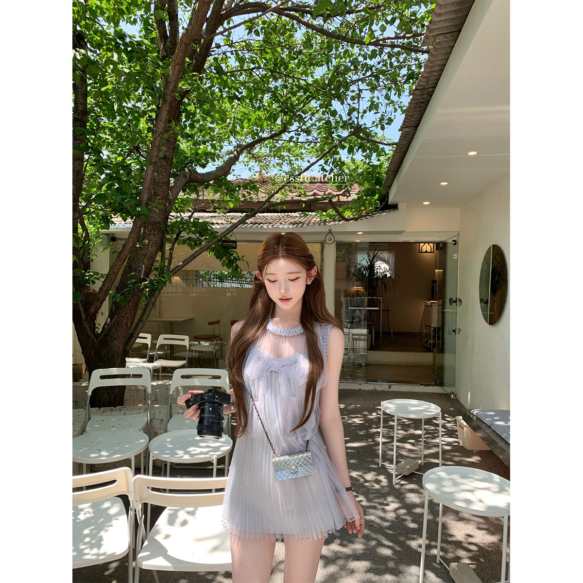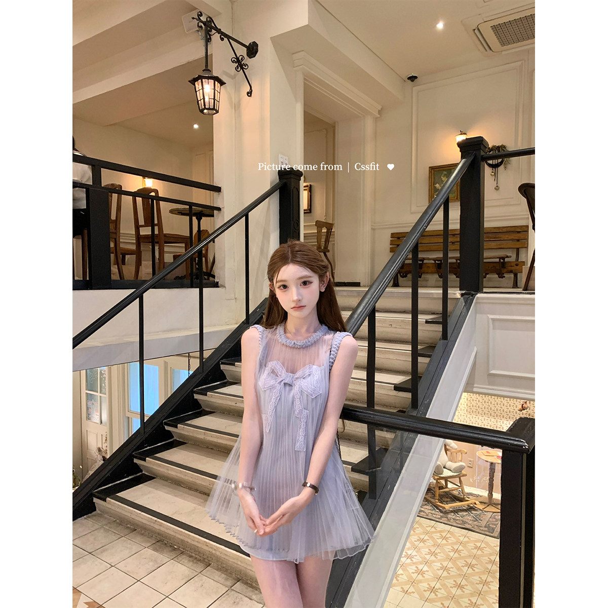 蓝灰刺绣蝴蝶结麻花编织无袖 仁川暮色 连衣裙短裙夏 迟伞伞25