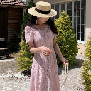 粉色蕾丝连衣裙度假出片漂亮长裙子 圆领短袖 2026夏季 穿搭明星同款