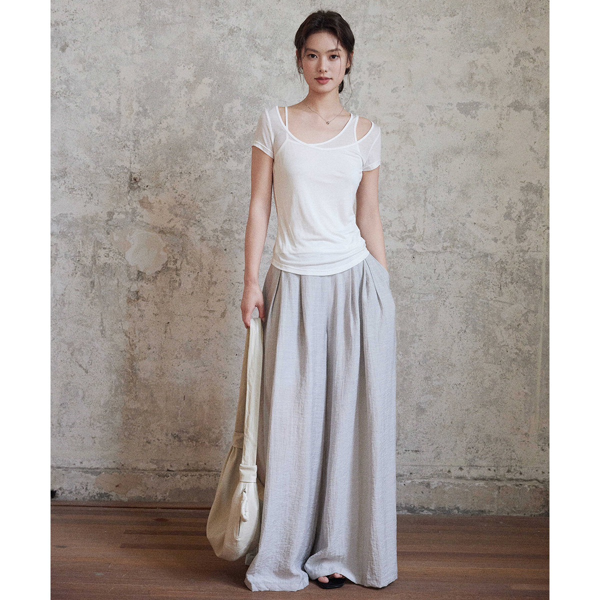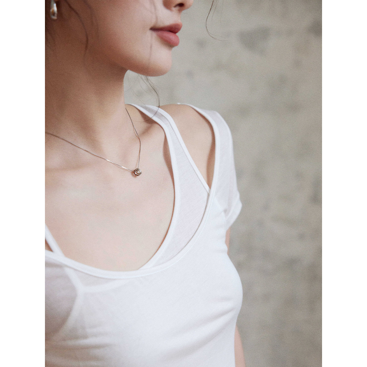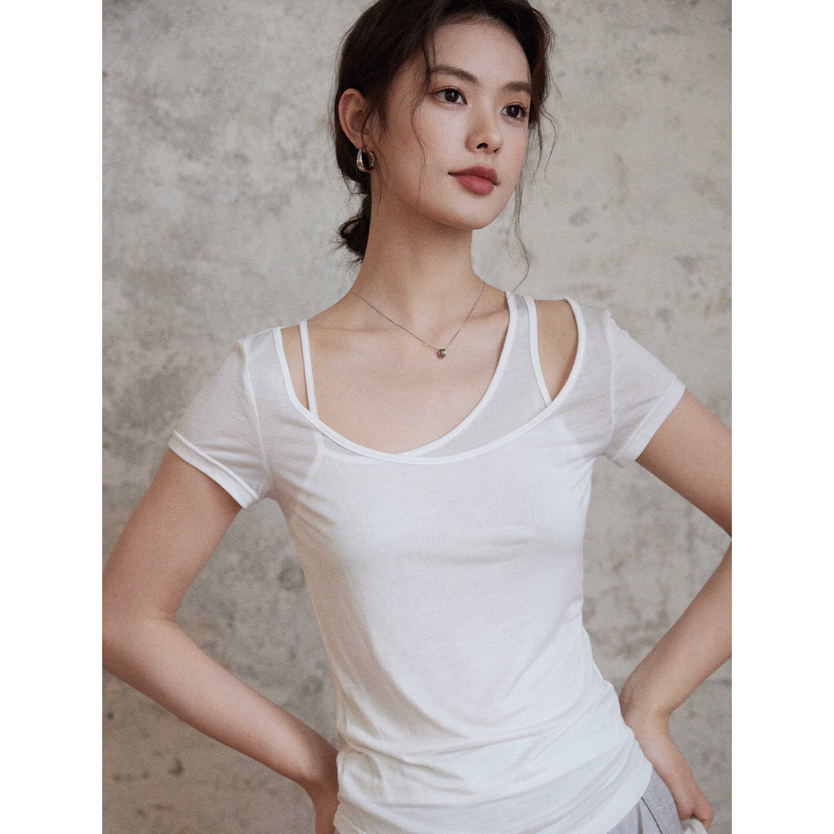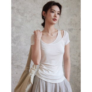 白色t恤女夏 清冷感微透1oo莱赛尔假两件露肩短袖 贰羊设计 纱影