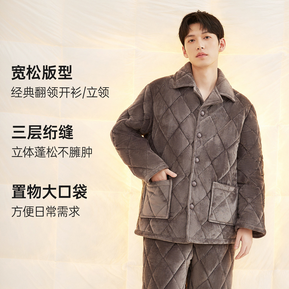 家居服套装 冬季 大码 男士 睡衣男加厚加绒三层夹棉保暖珊瑚绒秋冬款