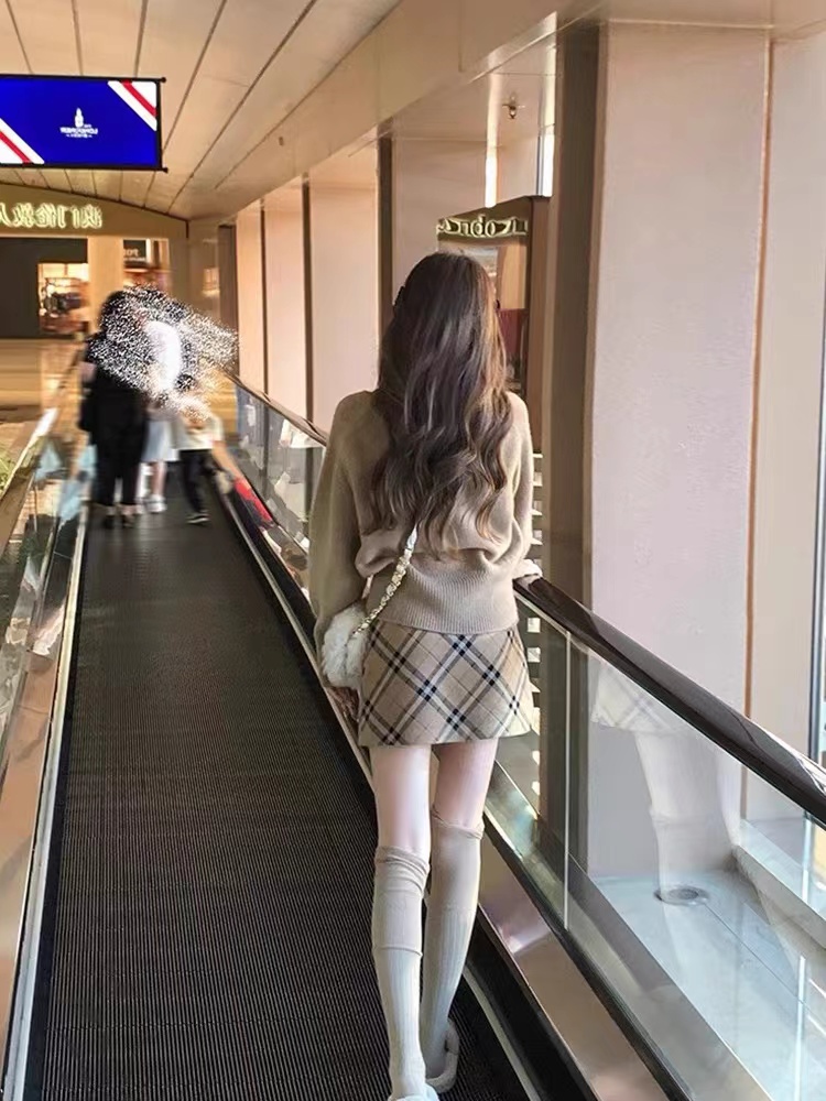 卡其格纹毛呢半身裙女秋冬2024新款 高腰百搭磨毛a字包臀短裙 大码
