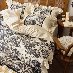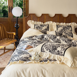法式 复古黑色100纯棉长绒棉四件套奶油风高级感全棉床上被套床品