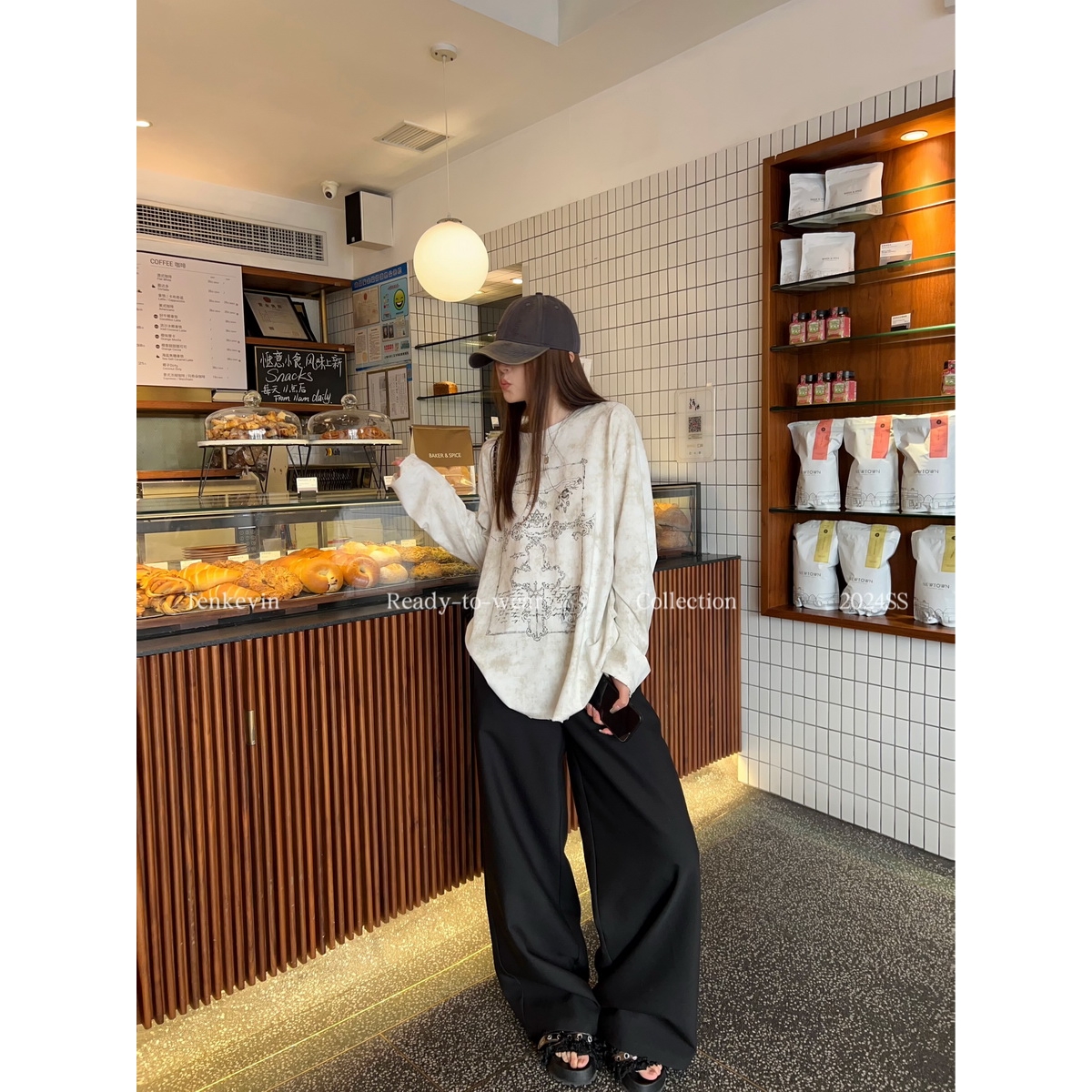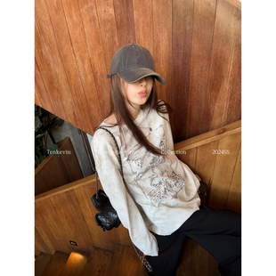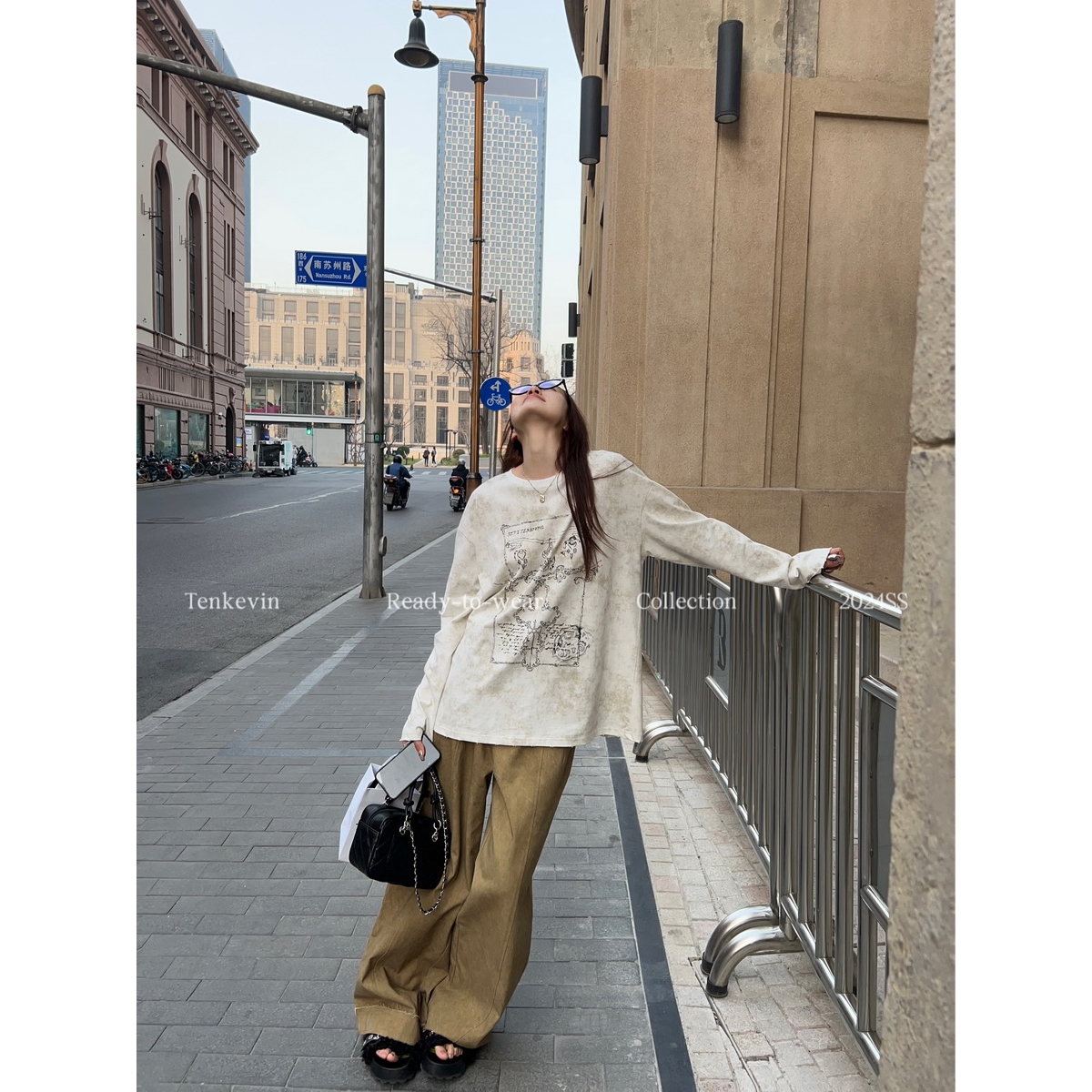 t恤女小个子宽松内搭打底衫 水洗做旧印花长袖 日落陷阱 十一石