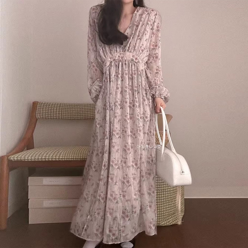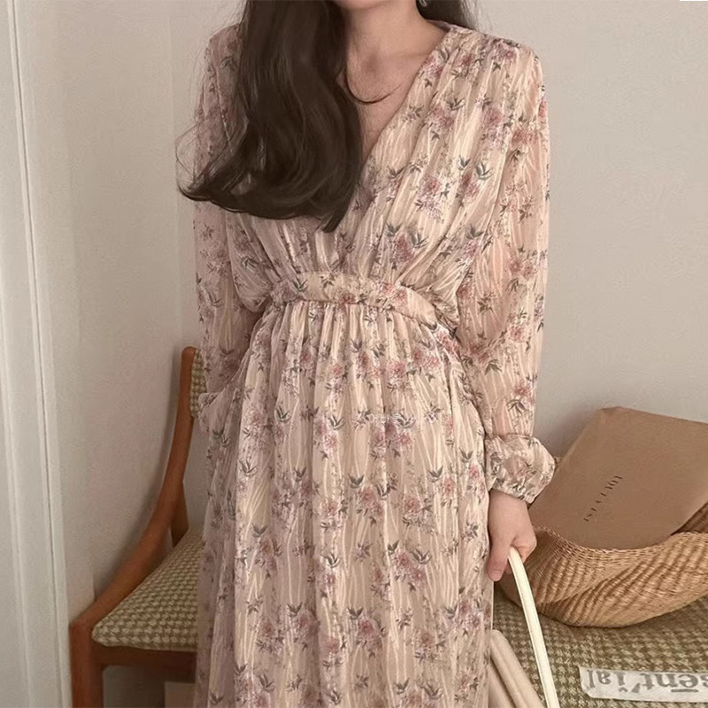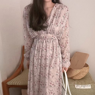 女洋气V领收腰修身 气质针织春秋 针织打底裙纯色连衣裙中长裙法式
