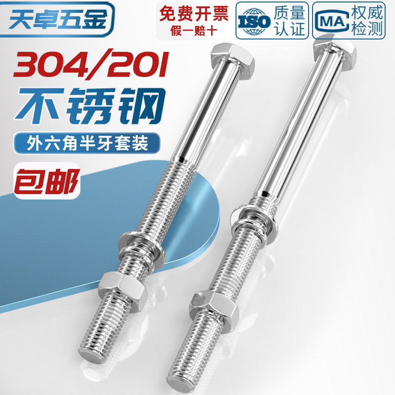 M20 加长螺栓穿墙螺杆M6M8 304 201不锈钢半牙外六角螺丝螺母套装