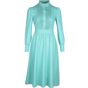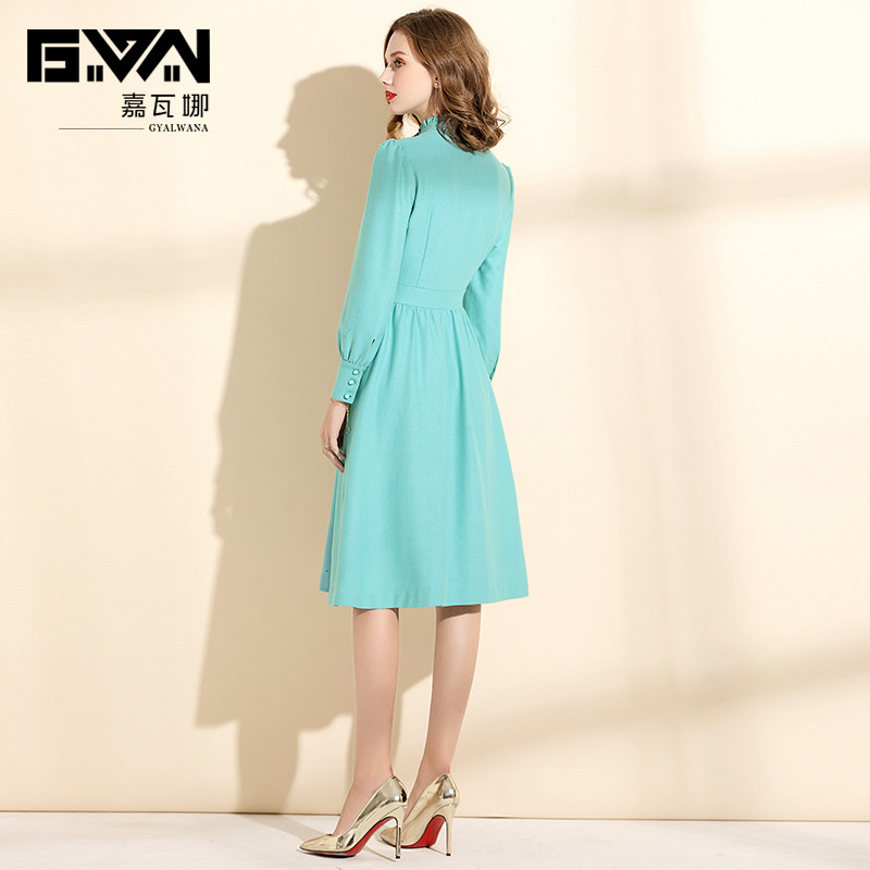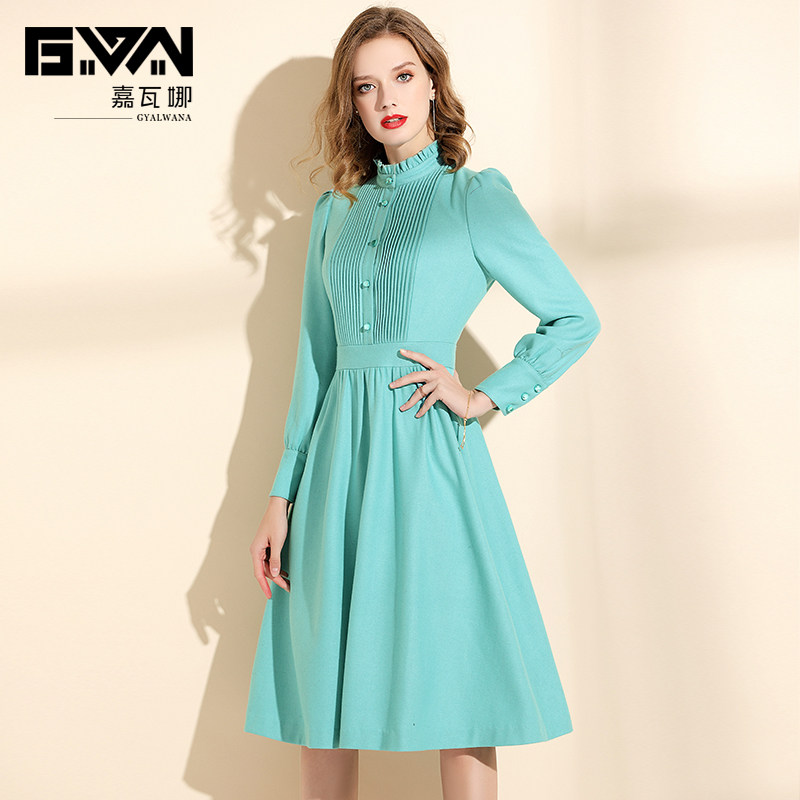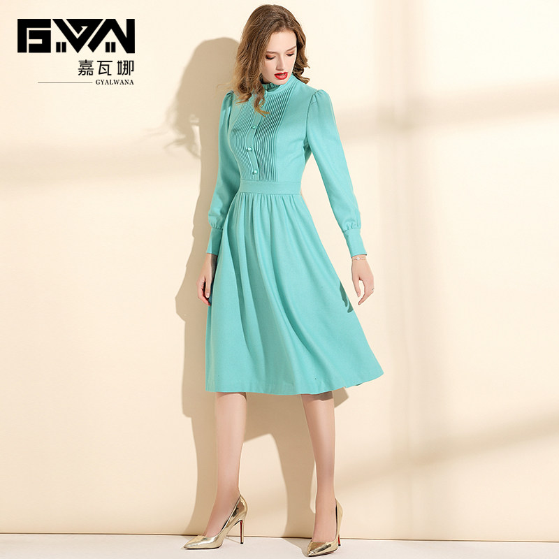 连衣裙女设计款 复古纯色长袖 褶皱显瘦掐腰长裙潮 欧美风时尚 KLIOU