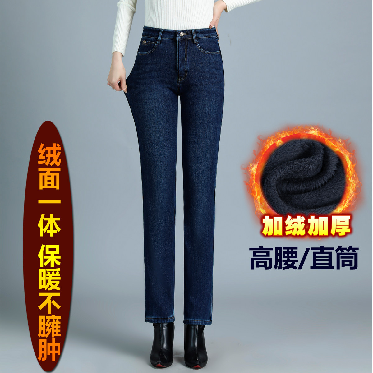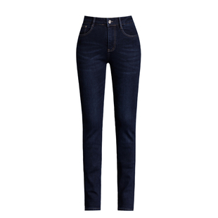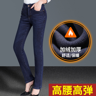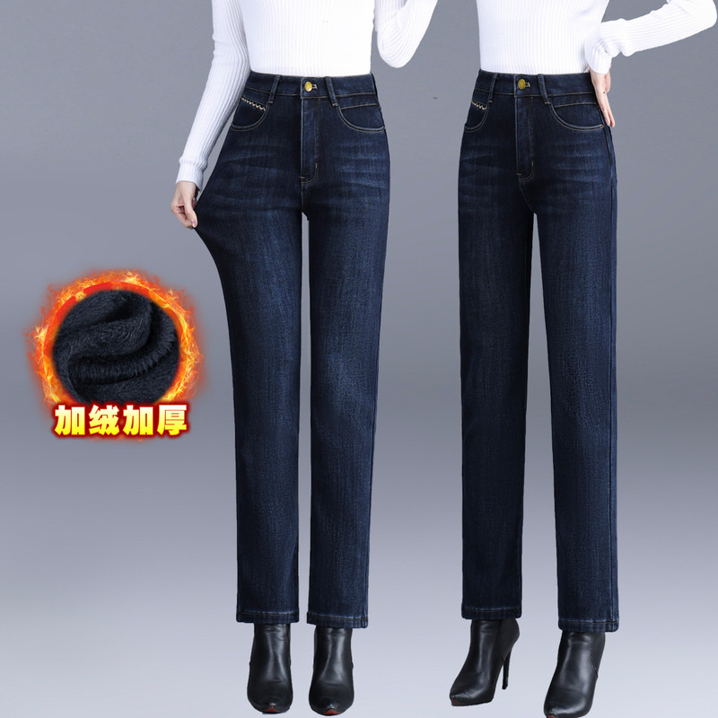 直筒长裤 加绒冬季 弹力显瘦大码 女士加厚中年妈妈女裤 子 高腰牛仔裤