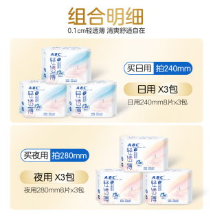 abc轻透薄0.1cm姨妈巾女日用组合3包夜用卫生巾 3件 69元