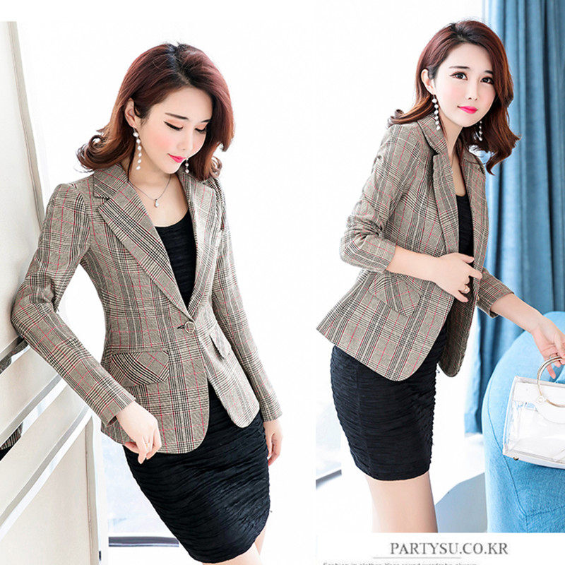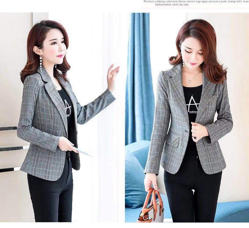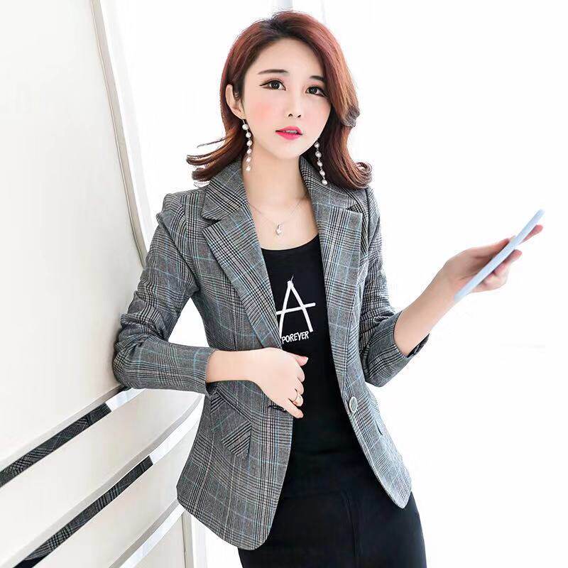 小西装 2019新款 百搭长袖 蓝色格子小西服收腰修身 短外套潮 春秋女装