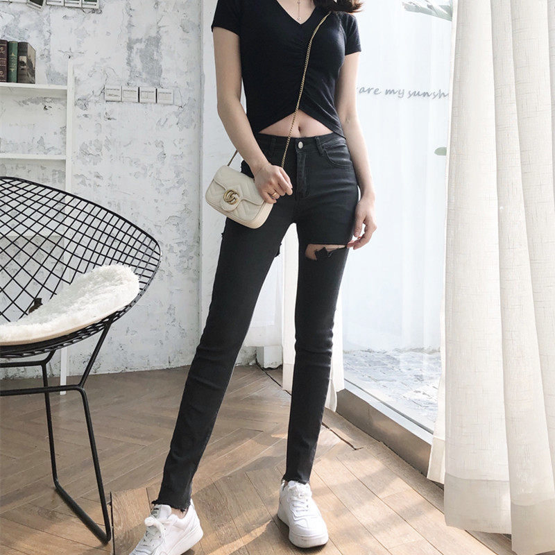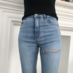 前后破洞 女横切割破chic修身 博主170高个子加长小脚铅笔裤 牛仔裤