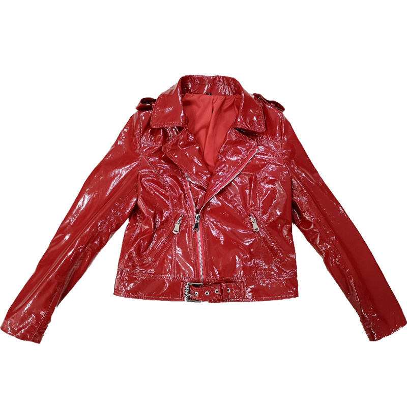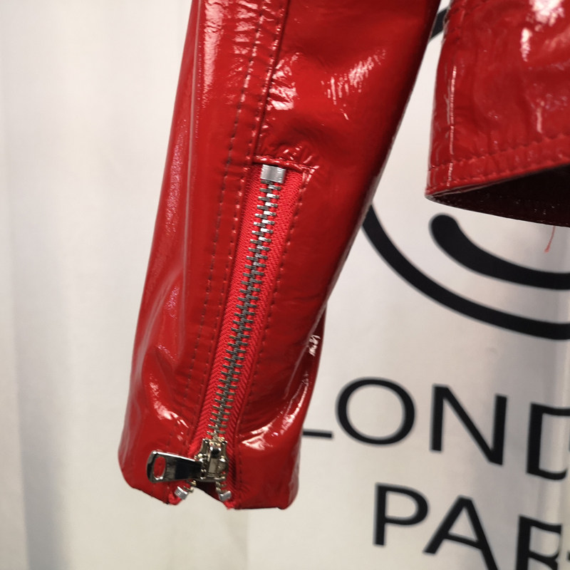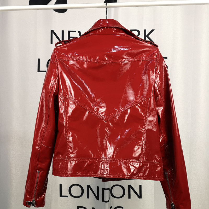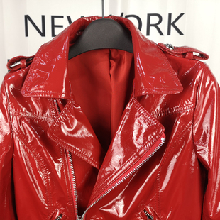 漆皮修身 真皮皮衣女短款 机车外套绵羊皮亮面皮夹克红 新款 2026春季