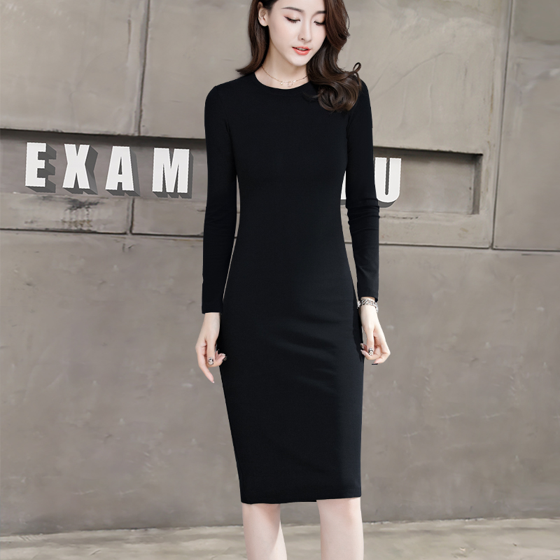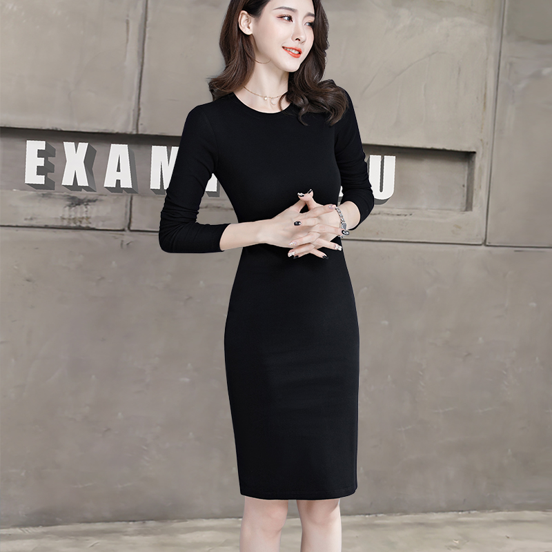 连体一步长裙 内搭小圆领修身 黑色打底连衣裙女春秋中长薄款 紧修身