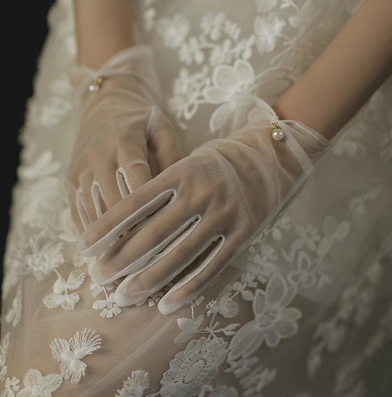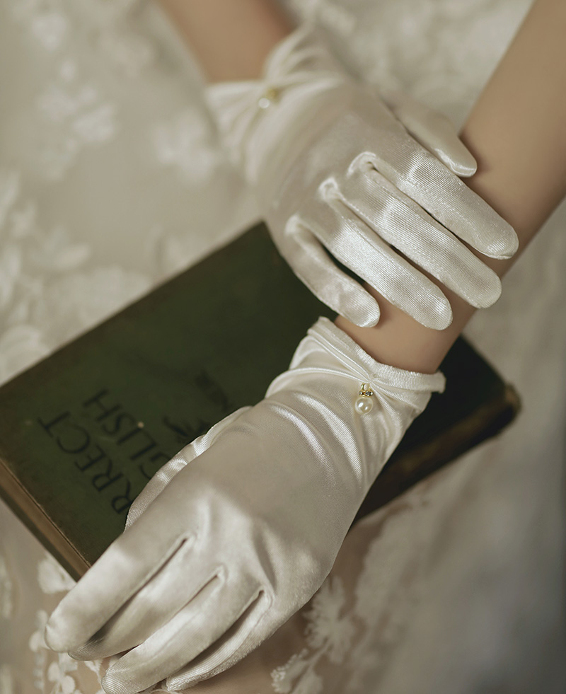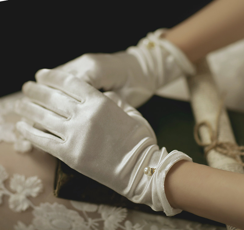 新娘手套蕾丝黑白酒红色结婚礼服秀禾服白纱婚纱缎面短款 优雅复古