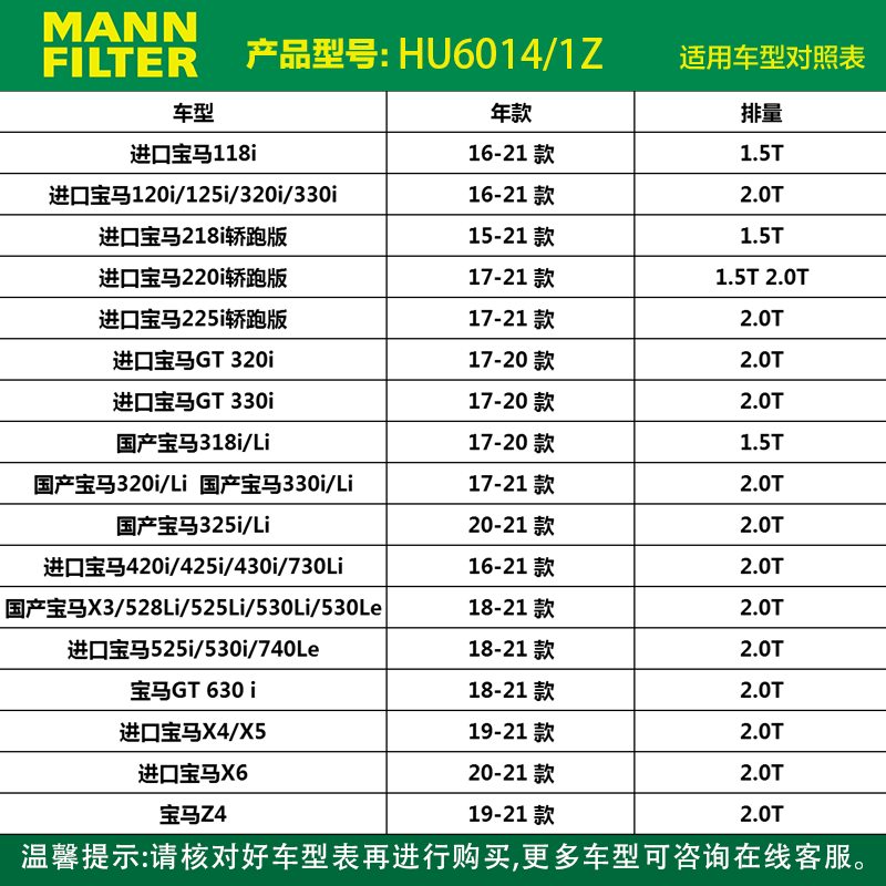 曼牌HU6014 1Z机油格滤芯适用进口宝马1系2系3系4系5系6系7系
