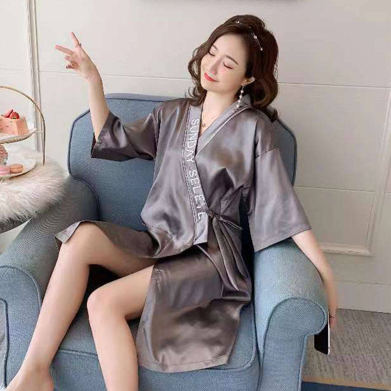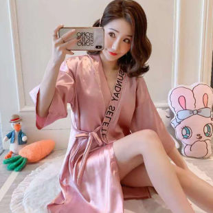 冰丝睡袍女夏季 系带浴衣女士浴袍单件 性感睡衣冰丝蕾丝春秋长袖