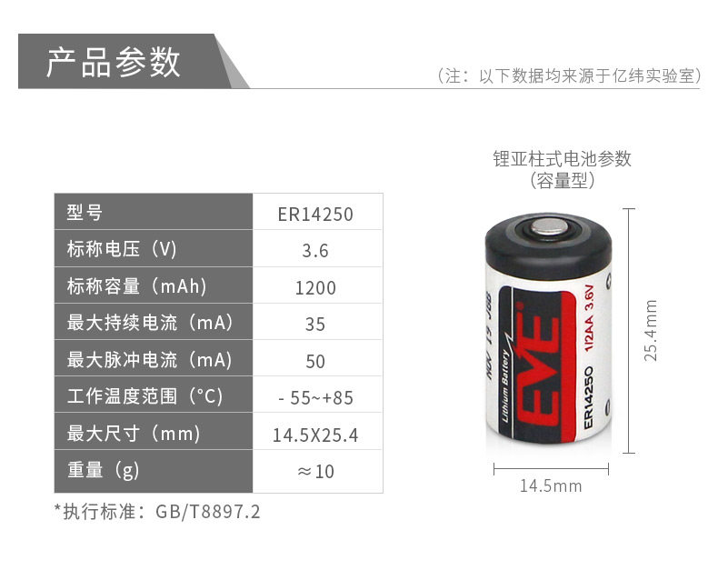 EVE亿纬锂能ER14250锂亚电池3.6V锂原电池锂电池1200mAh电表PLC工控设备