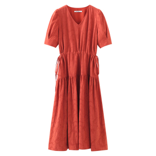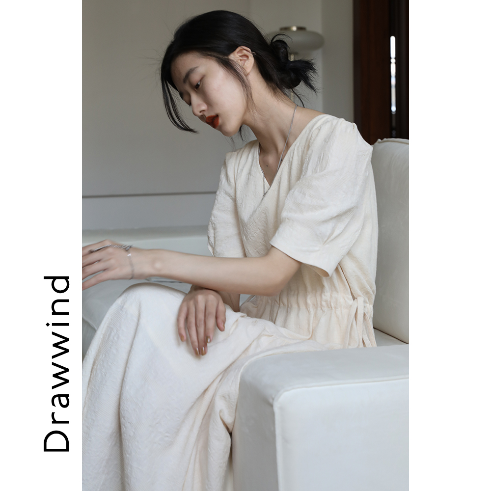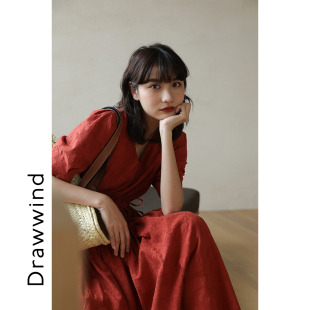 收腰裙子 显瘦复古泡泡袖 画风drawwind短袖 V领连衣裙女夏2024新款