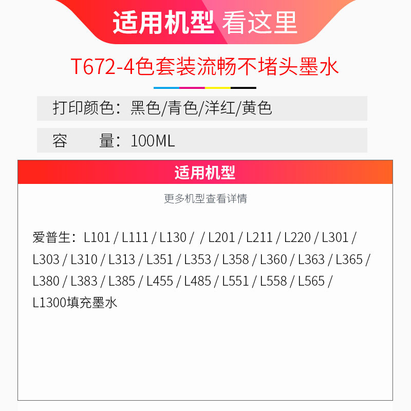 L363 L551墨水黑 L380 L130 L1300 L383 L360 L313 L565 天威T6721 L101 T6724打印机墨水672适用爱普生L310