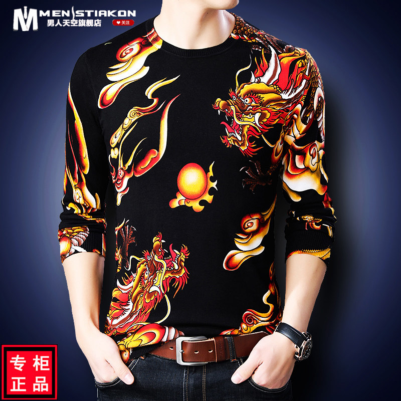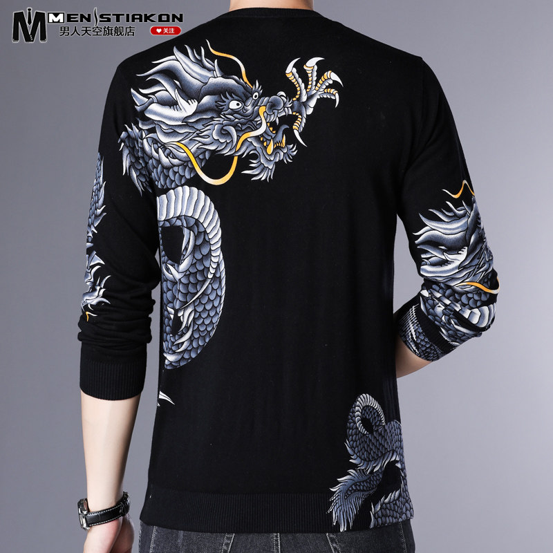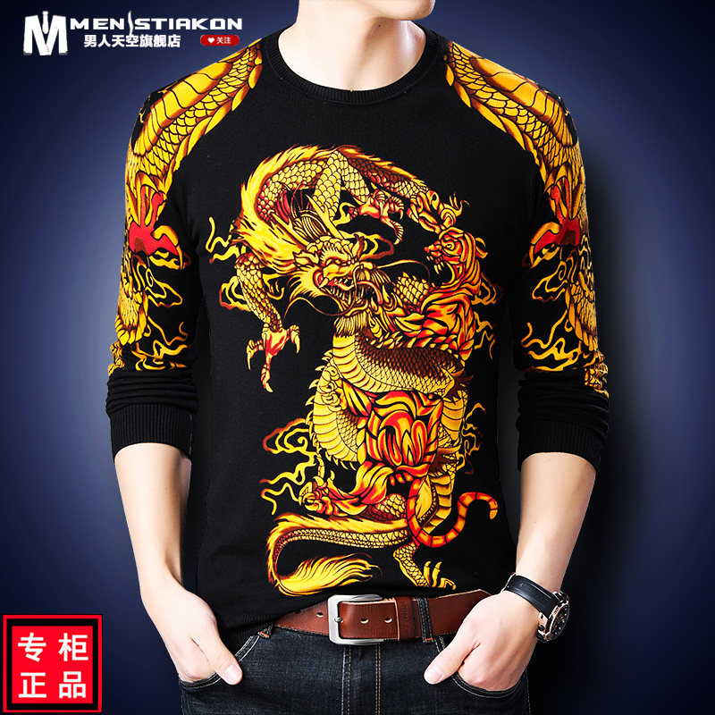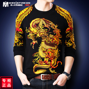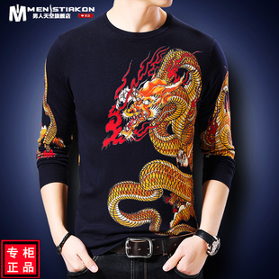 男秋季 男士 潮流春秋薄款 t恤中国风龙图案中年针织衫 打底毛衣 长袖