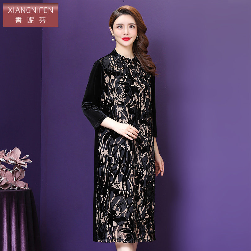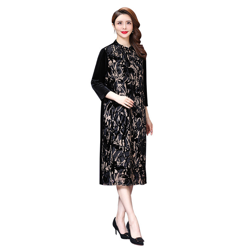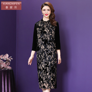 高端2025秋季 女装 黑色拼接复古长袖 大码 修身 香妮芬丝绒连衣裙新款