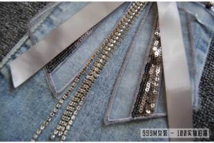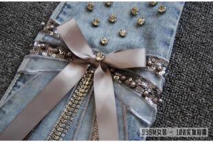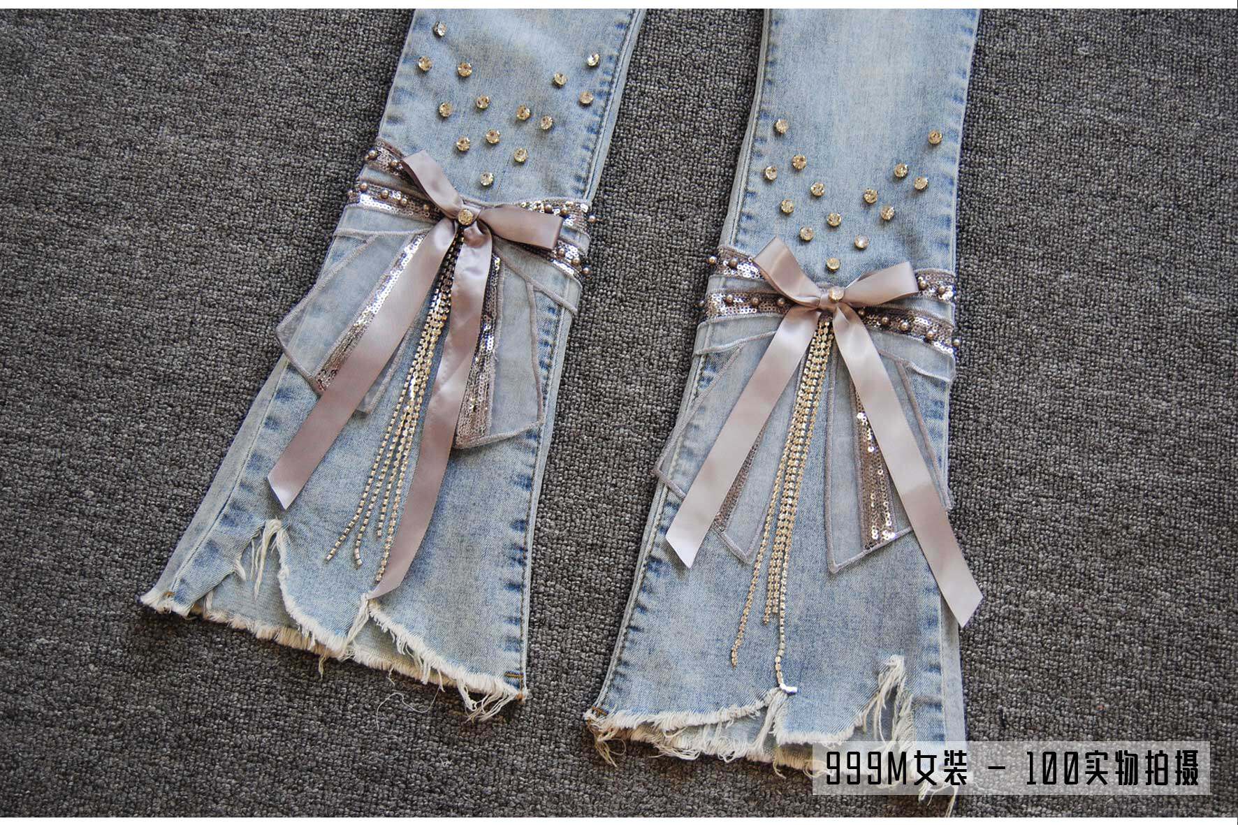 女高腰钉珠流苏带钻蝴蝶结不规则磨破牛仔裤 9分喇叭裤 时尚 春夏季
