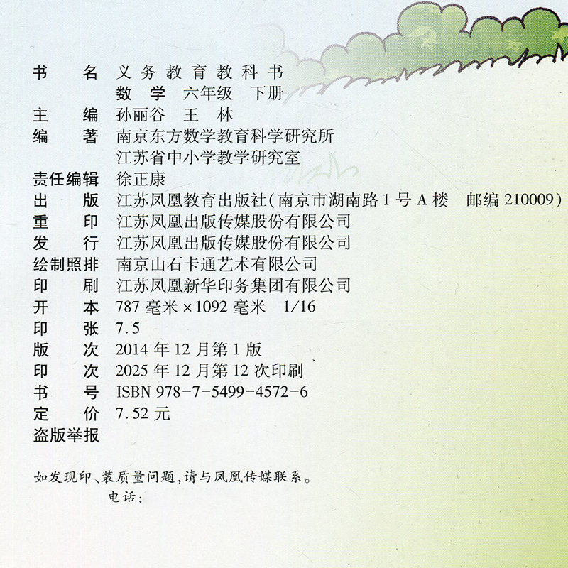 学生教材 社旗舰店XGX 苏教版 江苏凤凰教育出版 义务教育教科书 六年级下册 官网正版 数学书 小学数学课本6下 2026春