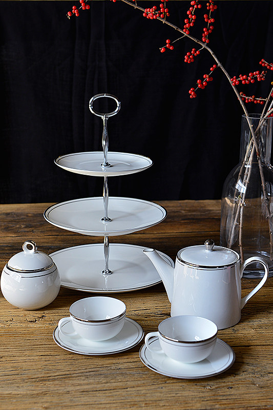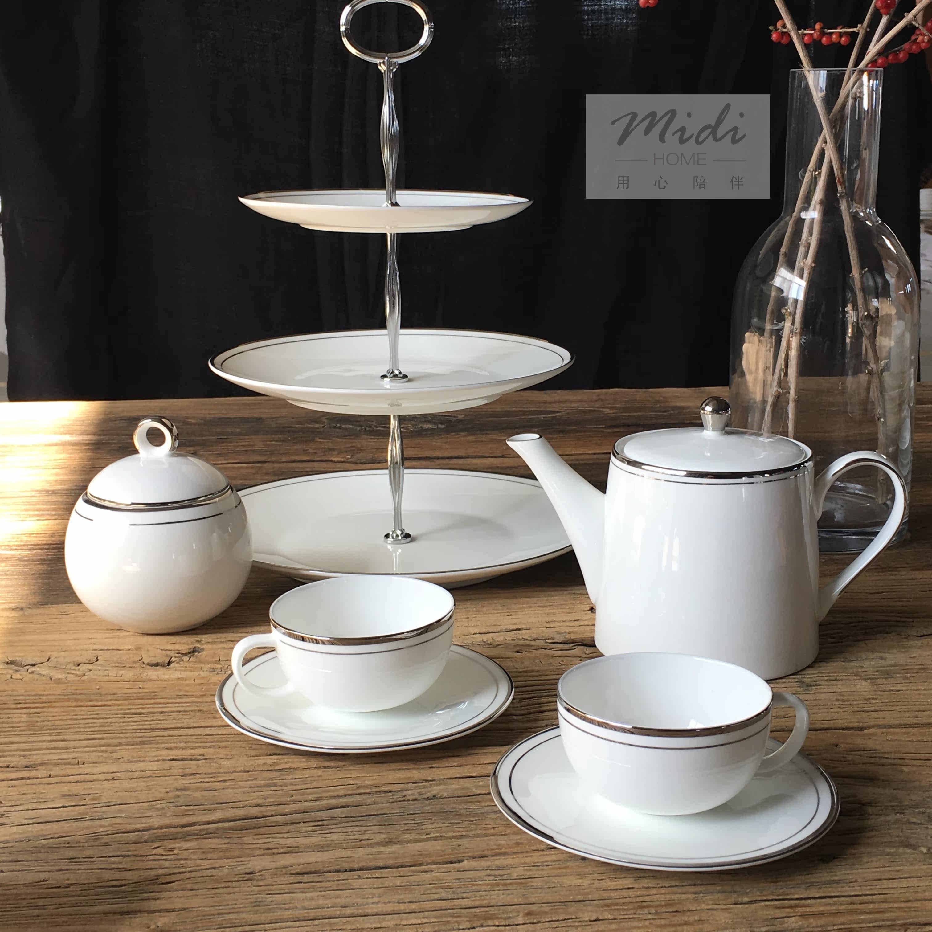 midi定制0.9L双银线纯白高骨瓷白金红茶下午茶壶咖啡壶过滤孔商务
