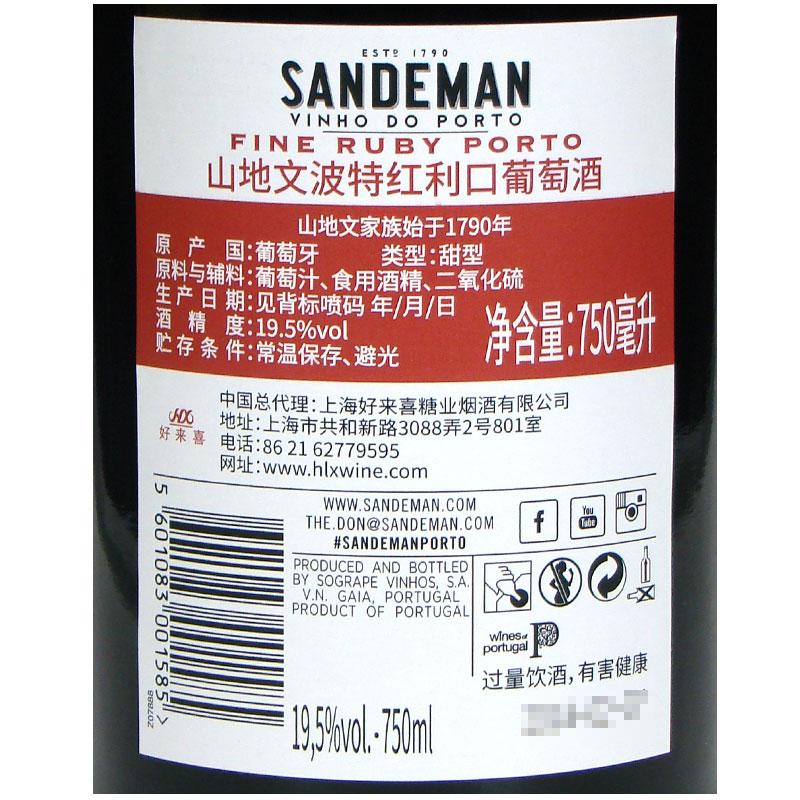 Porto19.5%波特红葡萄酒 Ruby 葡萄牙原装 进口山地文钵酒Sandeman