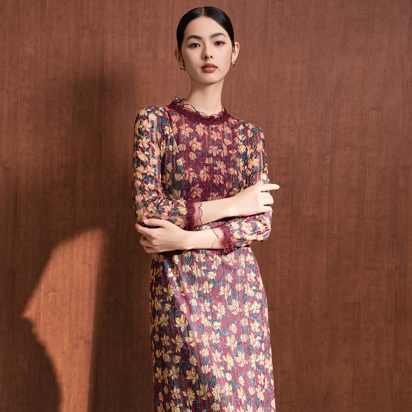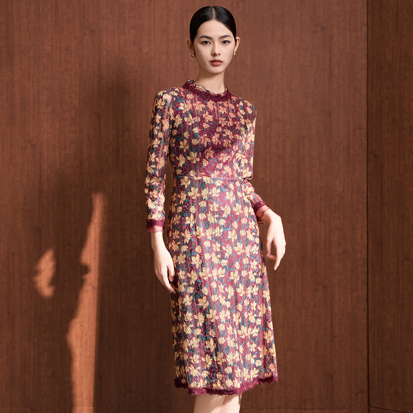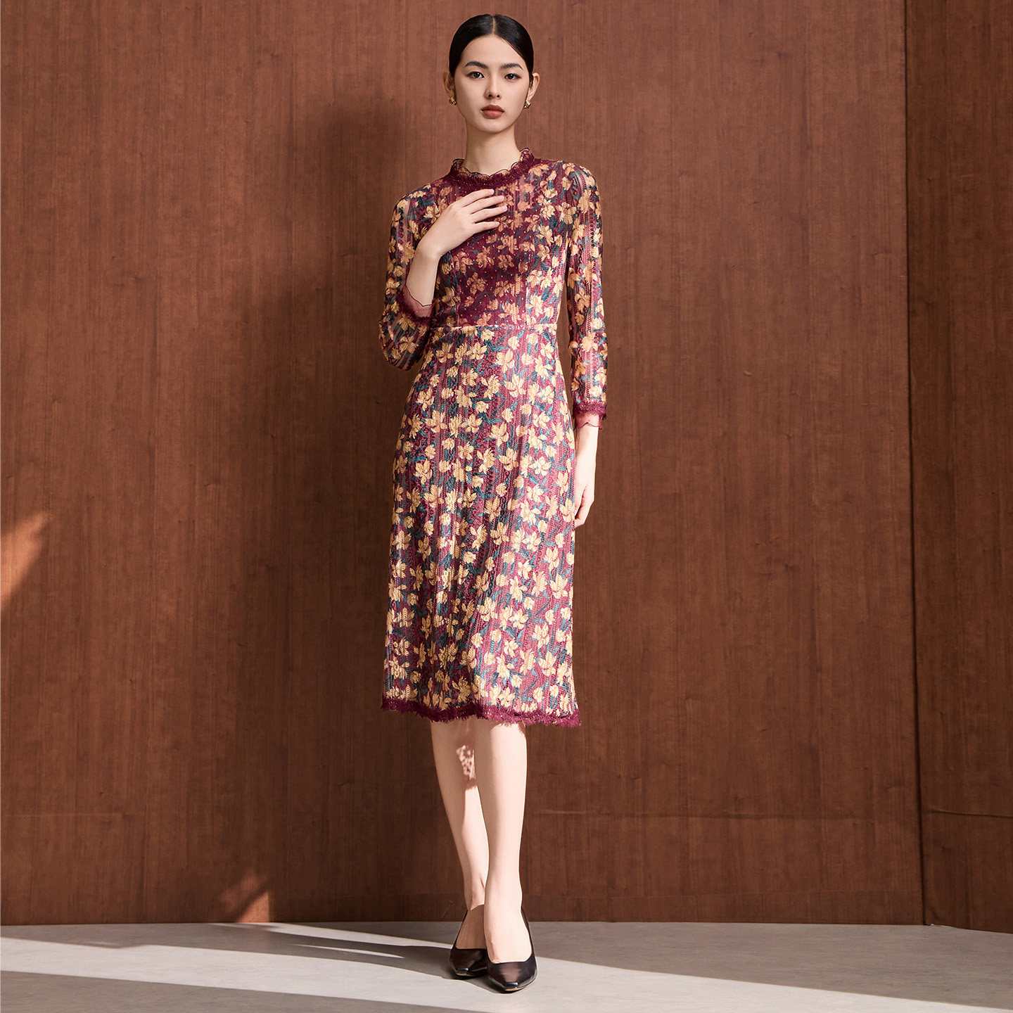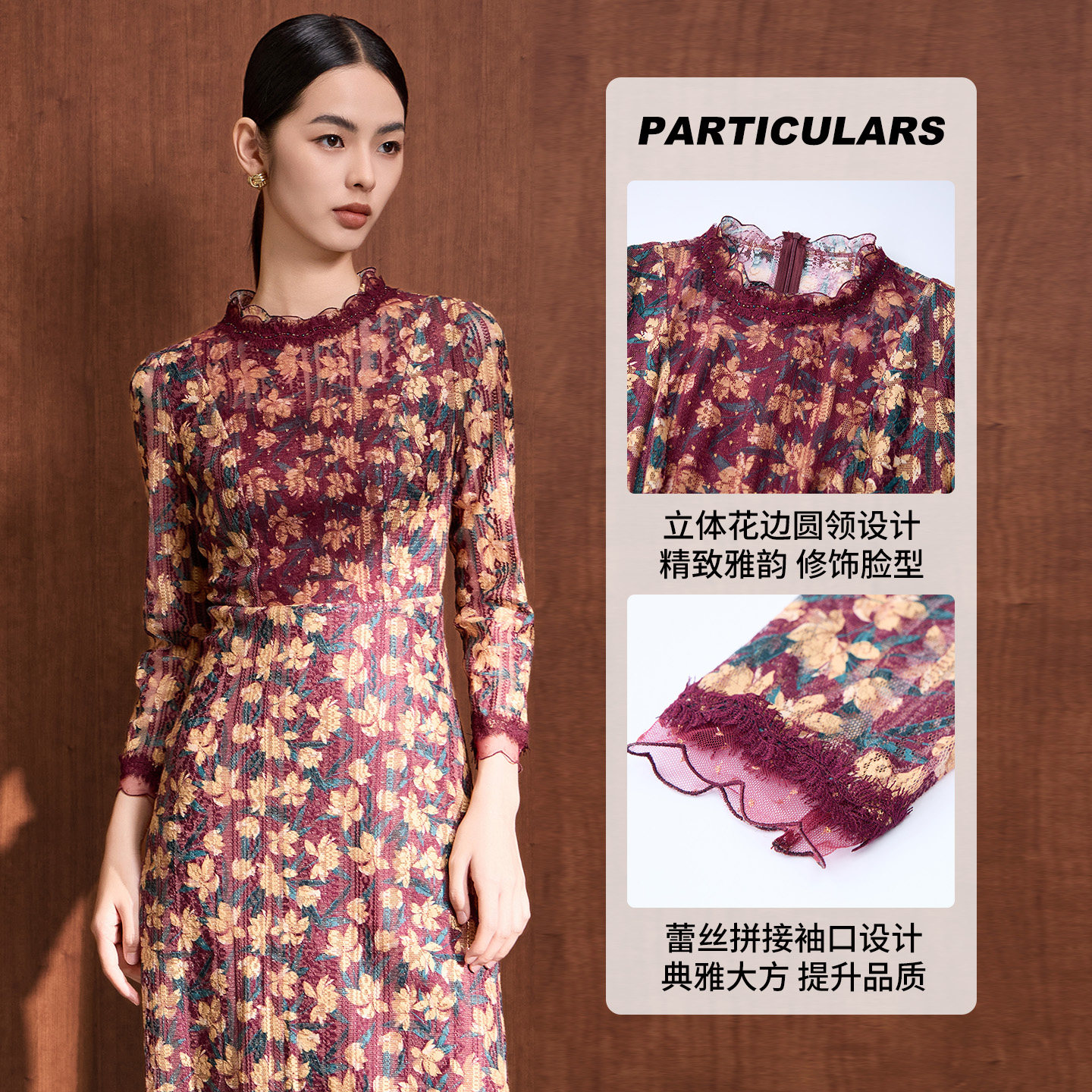 连衣裙子气质复古法式 马天奴秋冬女装 酒红印花蕾丝花边领收腰长袖