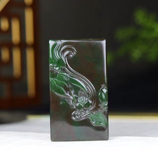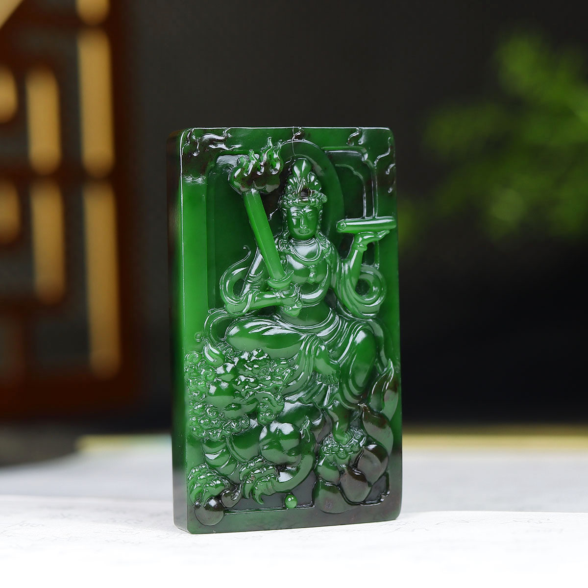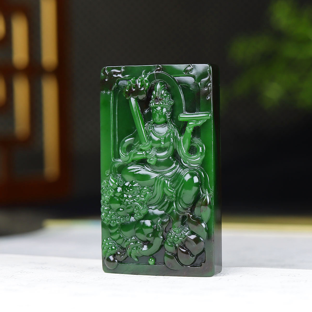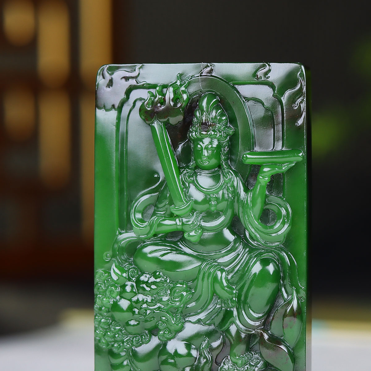 俄罗斯和田玉菠菜绿碧玉文殊菩萨挂件玉牌吊坠96g 古晨珠宝